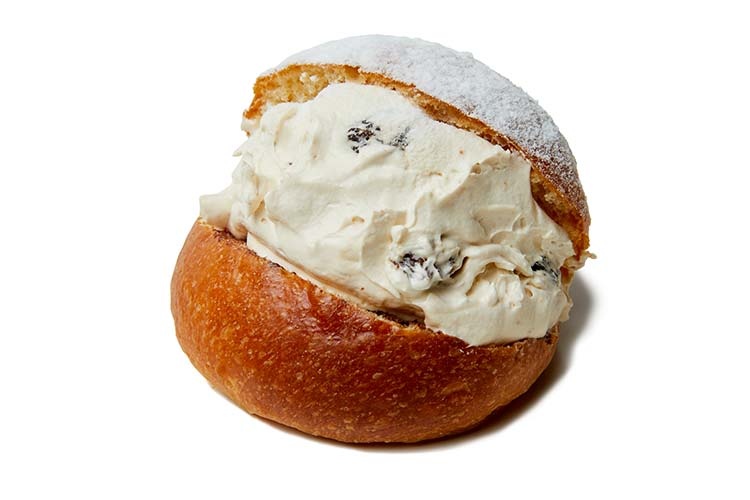 ブリオッシュ生地にたっぷりのラムレーズンクリームを搾り、粉糖をかけて仕上げました。ビターなチョコレートソースがアクセントになり、飽きずに最後までたのしめます。
