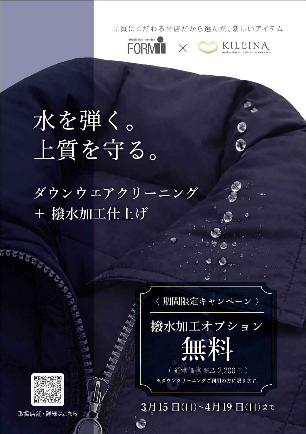 期間中、ダウンクリーニングご依頼のお客様に、通常価格 税込2,200円の「撥水加工」オプションを追加料金なしでサービスさせていただきます。(※おひとり様、何着でもご利用いただけます♪)