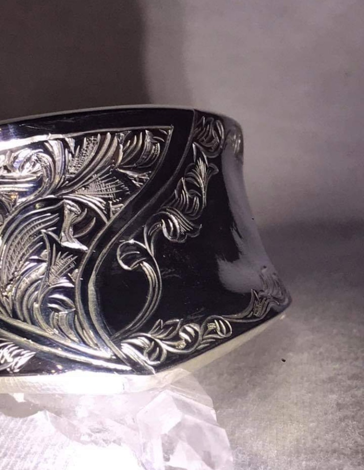 涼しい風を運んでくる様なラインを描いた彫りと銀肌のコントラストの美しいバングルです。
