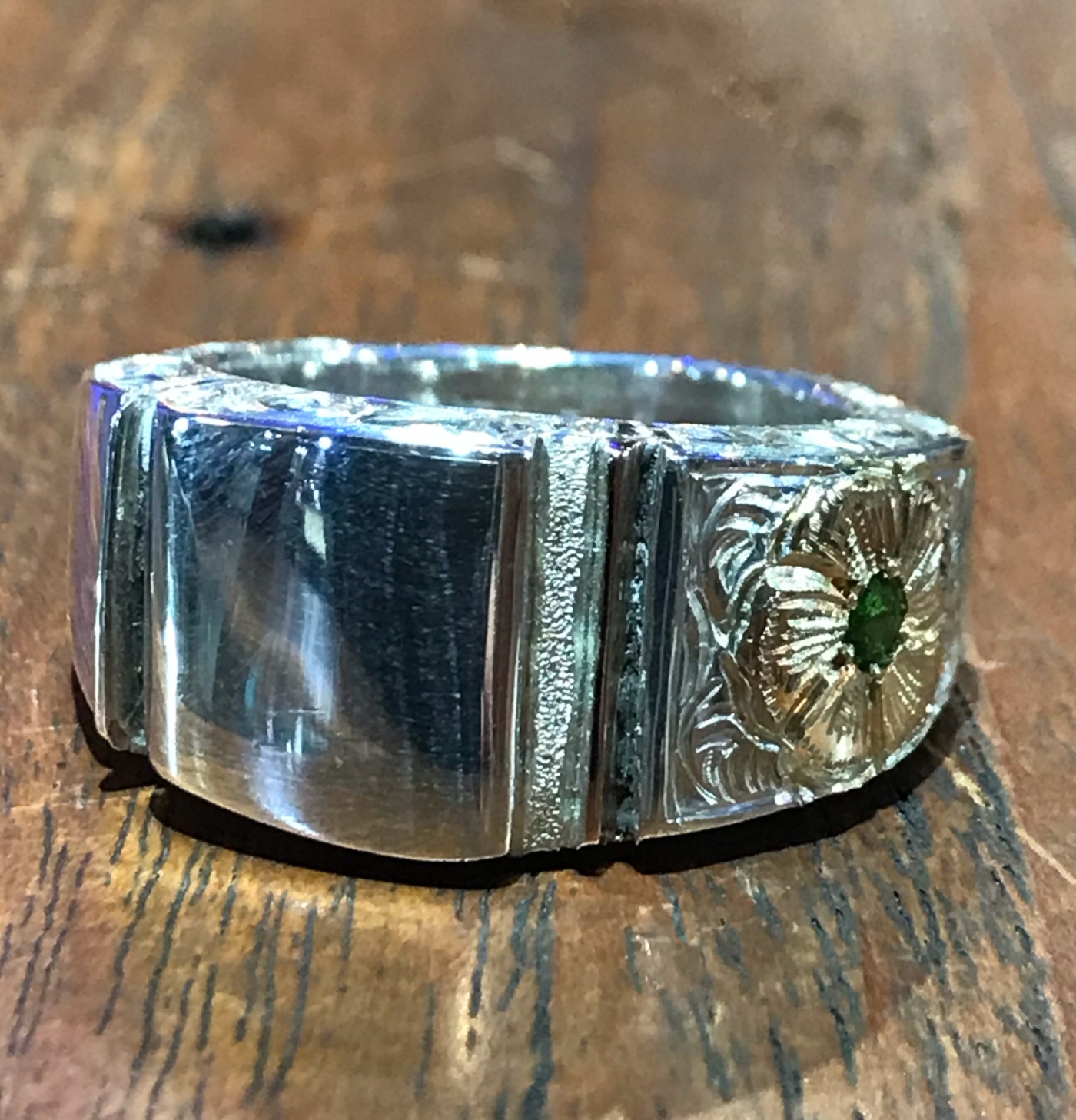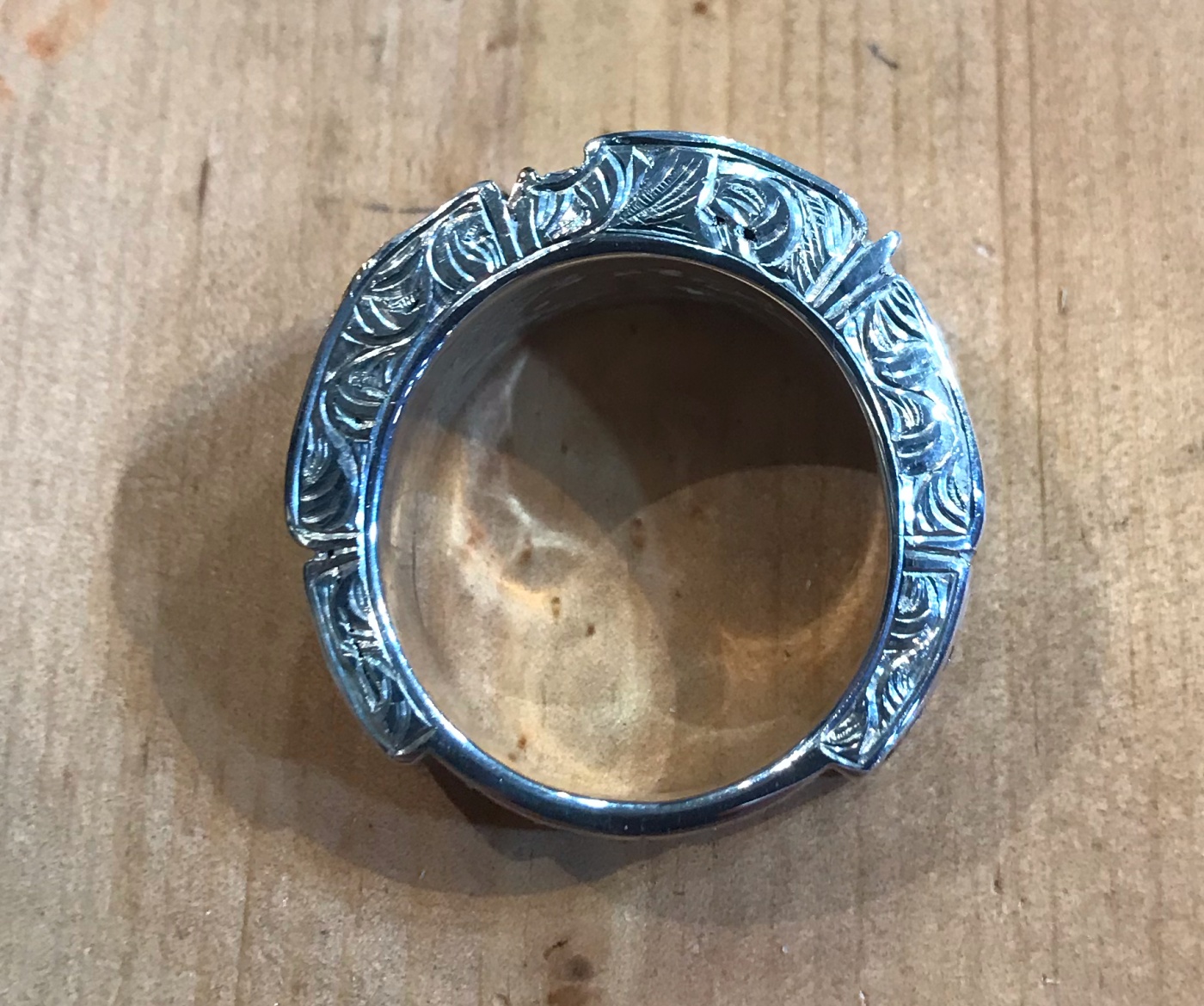 様々な片を組み合わせたようなリングは基盤となるリングにオーバーレイと呼ばれる技法のように厚みの異なる銀の板をロウ付けして成型されています