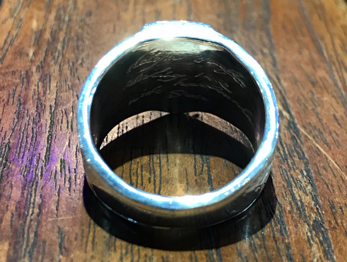 中央部に道をイメージしたシルバーのプレーンなプレートが配置され、両サイドにはディープレリーフが施されており、さらには美しいブルーのタンザナイトが中心に配置されています