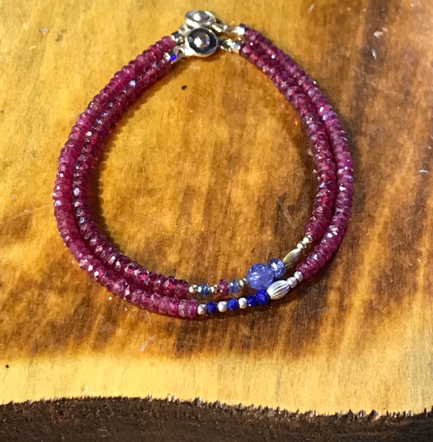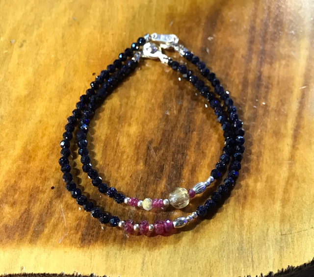 ブルー系のラピスラズリやターコイズ、レッド系のルビーやピンクトルマリン、ホワイトカラーのムーンストーン、ダークカラーに細かい粒が光るブルーサンドストーンなどなど様々なブレスレットが揃っています