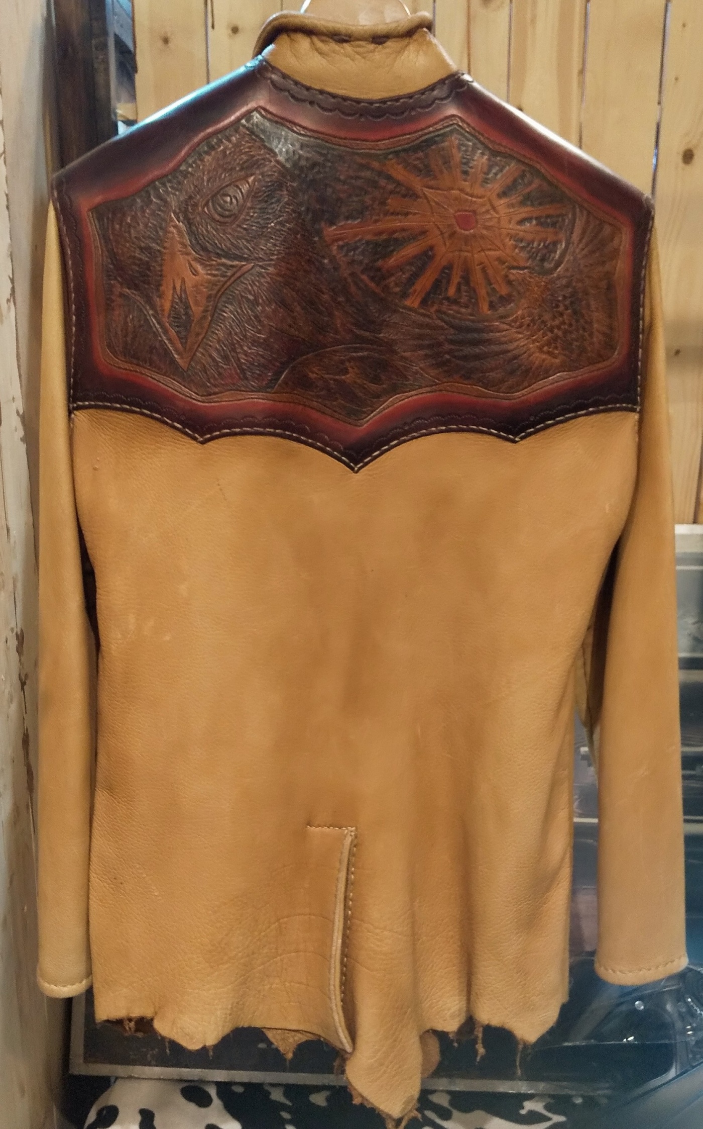 北米産の鹿革を使用したジャケットになります。ヨーク部分のカービングは、確りとした牛革にネイティブモチーフが両胸と背中にギッシリと大迫力で施されています。