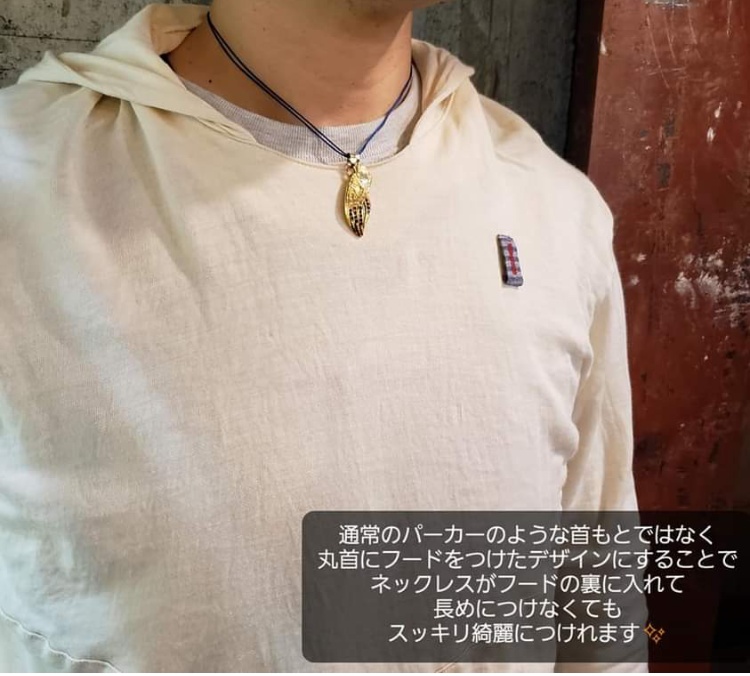 通常のパーカーのような首もとではなく、丸首にフードを別付けしたようなデザインにすることで、ネックレスをつけたい時にフードの下をくぐらせて長めにつけないといけない、もしくは服の中に入っちゃう問題が解決!