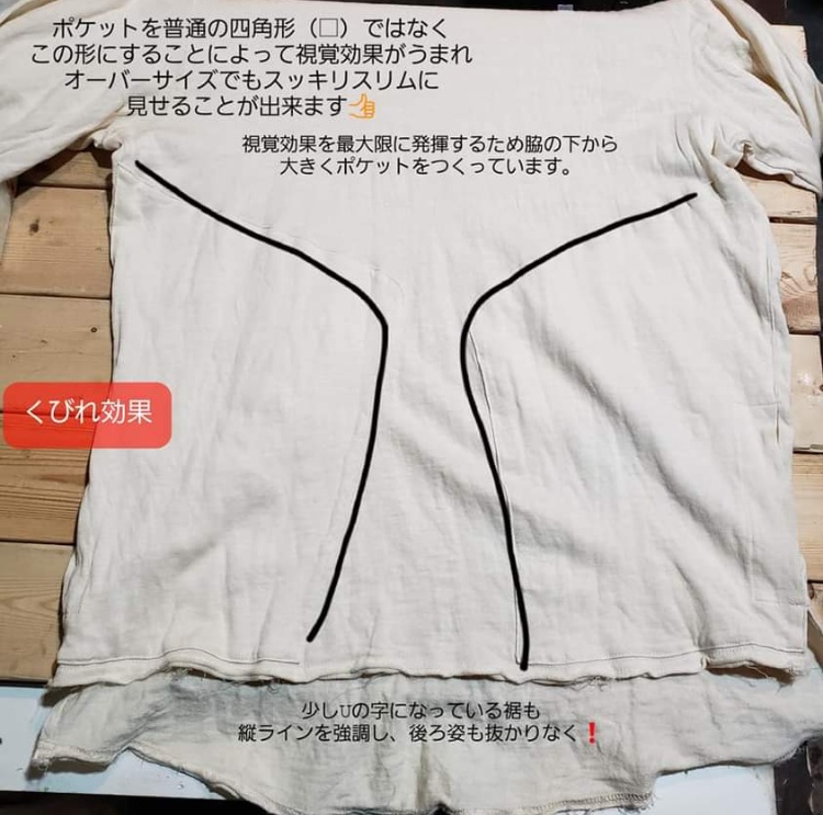脇の下から真横ではなく、中央に向かって斜め下にポケットが縫われていて、そこから裾に向かってそれぞれ左右に寄っていくように縫われていますよね。