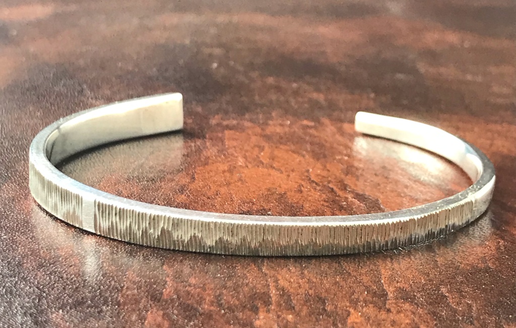 バングルの方は彫りを無数に入れる事によって向かい合った直線の先端の並びが光のラインを形作りバングルを動かすとキャッツアイのように光のラインが揺めきます