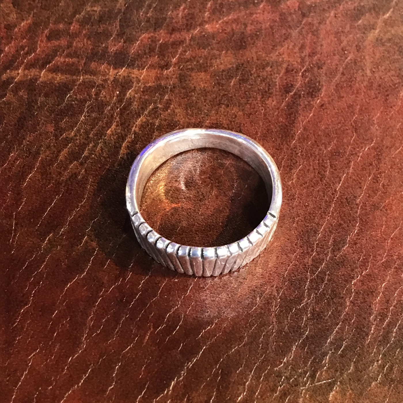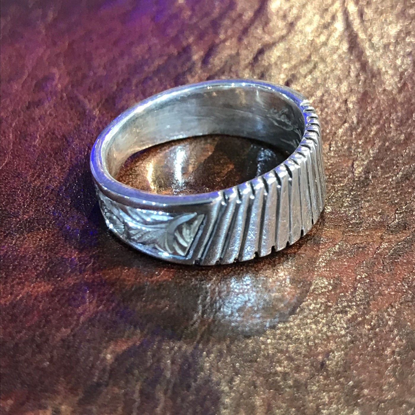 一般的なサンバーストのモチーフは360°の放射線状の線で構成されますがこのリングは180°ですので天上から光が降臨している様にも見えます