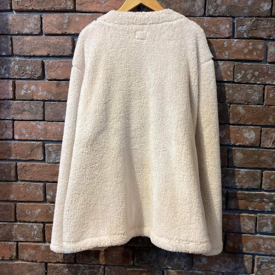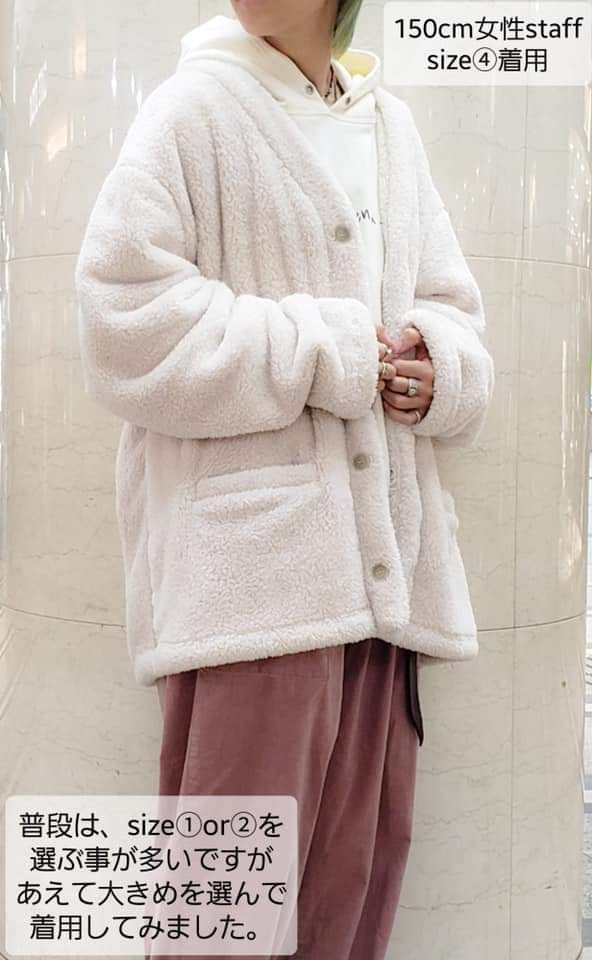 以前ご紹介のグリーンカラーのフリースカーディガンとは違い毛足が長く、アップして見るとまるで白珊瑚にも見えます