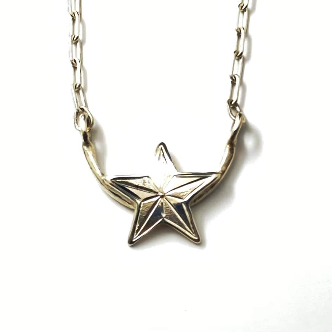 ペンダントトップとしてご好評いただいておりますドーム状の形とブライドカットが美しいSTARペンダントトップにアーム状のパーツを追加し、両サイドにチェーンを取り付けたネックレスとなっております
