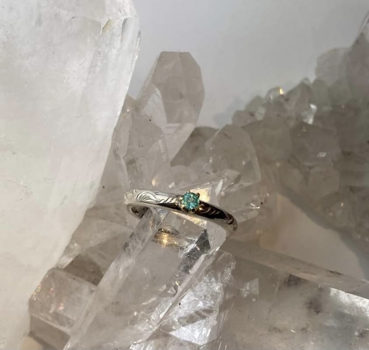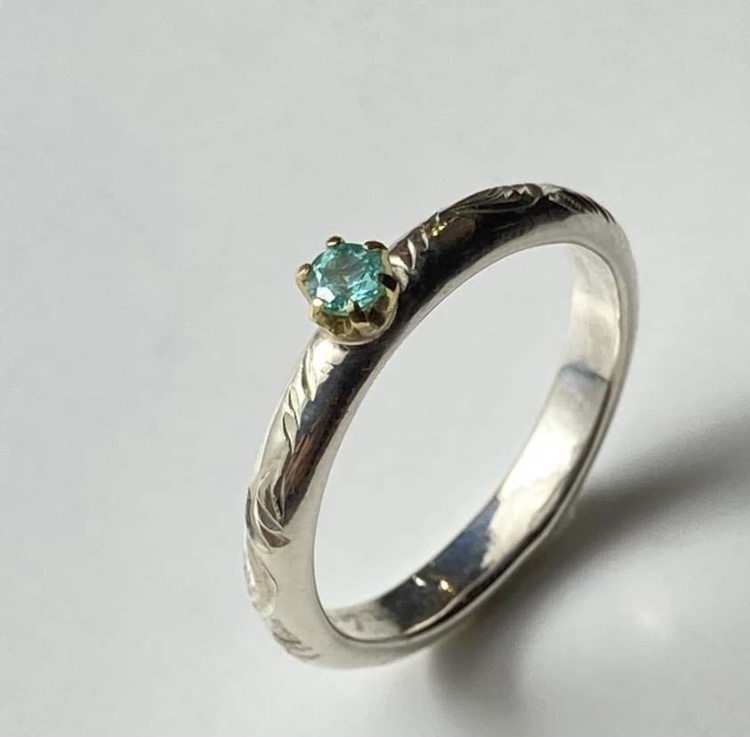 ブライトカットのシルバーの素材を活かした輝き、ゴールドならではの深みのある輝き、そしてパライバトルマリンならではの透明感と鮮やかなネオンブルーの調和したリングとなっています