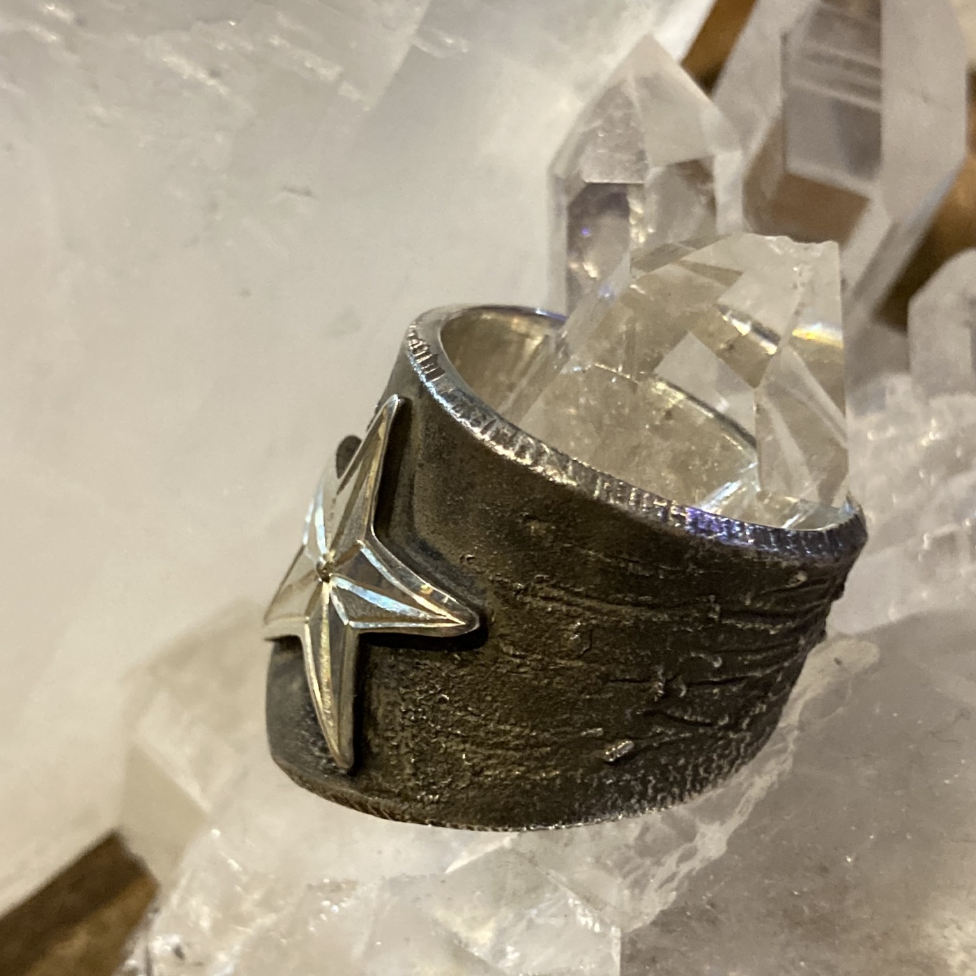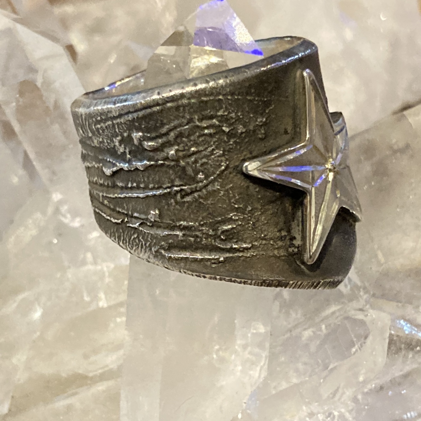 こちらのリングはメルトダウンという技法で溶けたような質感と不規則な凹凸を生み出し、燻しをかけています