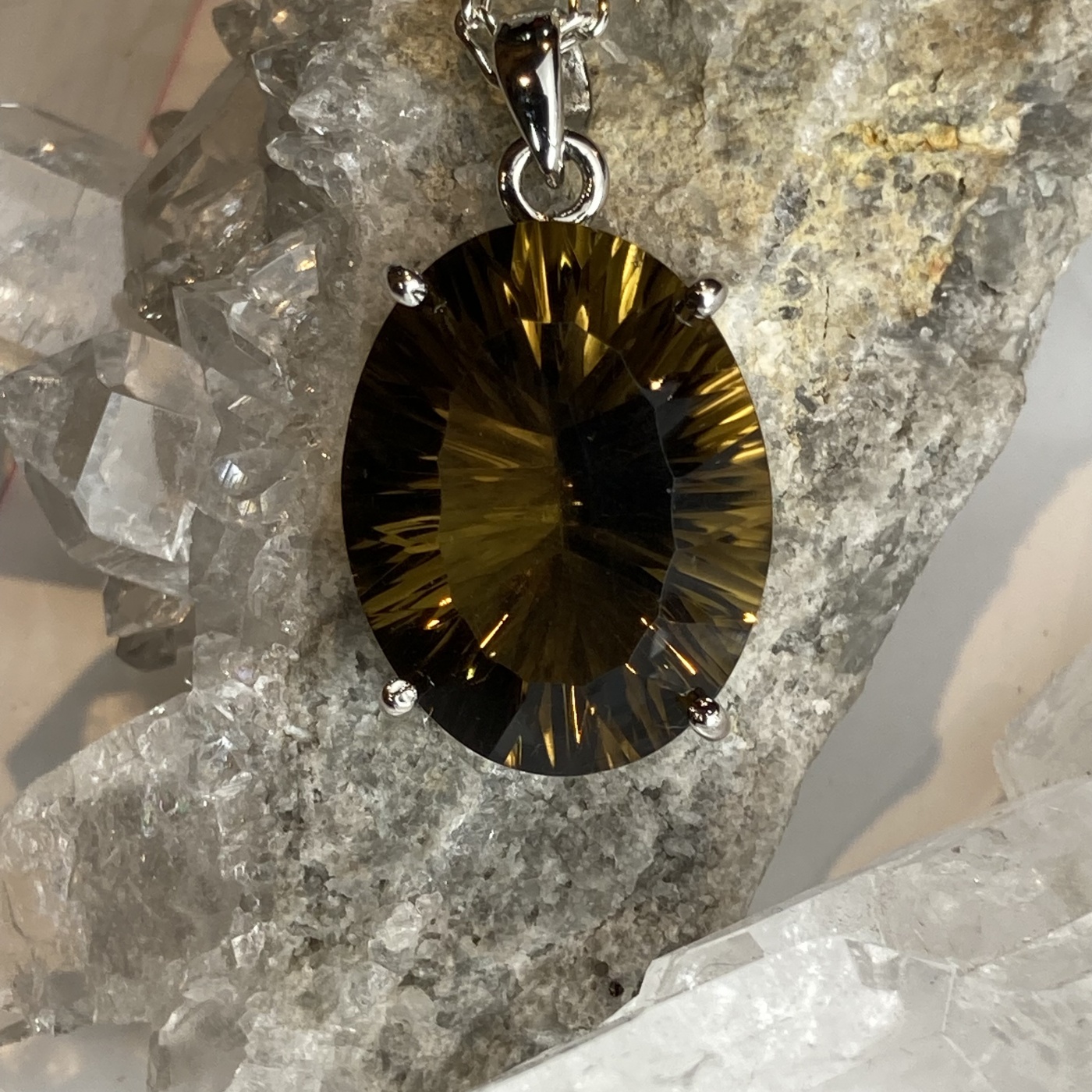 オリーブクォーツと聞き慣れないかもしれませんがスモーキークォーツに緑味が加わった様なオリーブの実の様なカラーの水晶の一種です。