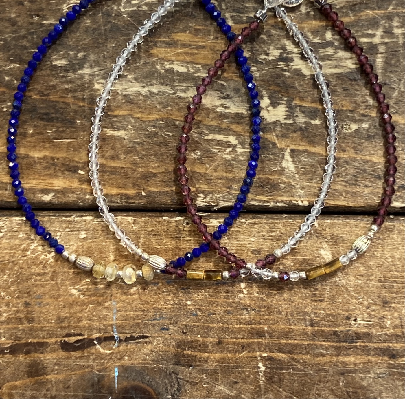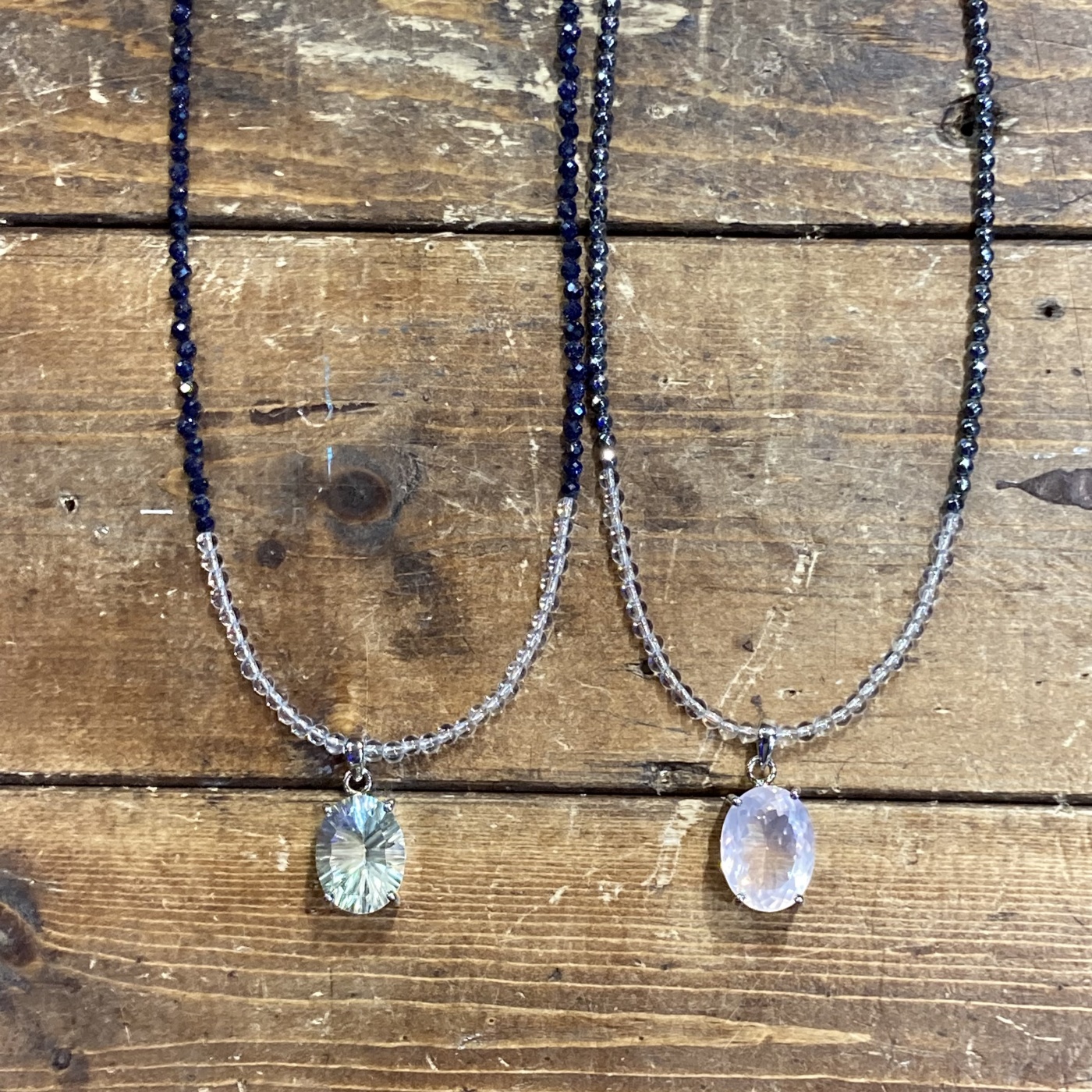 ヘマタイトやブルーサンドストーンとコンビのネックレスはモノトーンに近い合わせ方なのでトップに華やかなカラーを持ってくる事でトップのカラーをより美しく見せれる事かと思います。