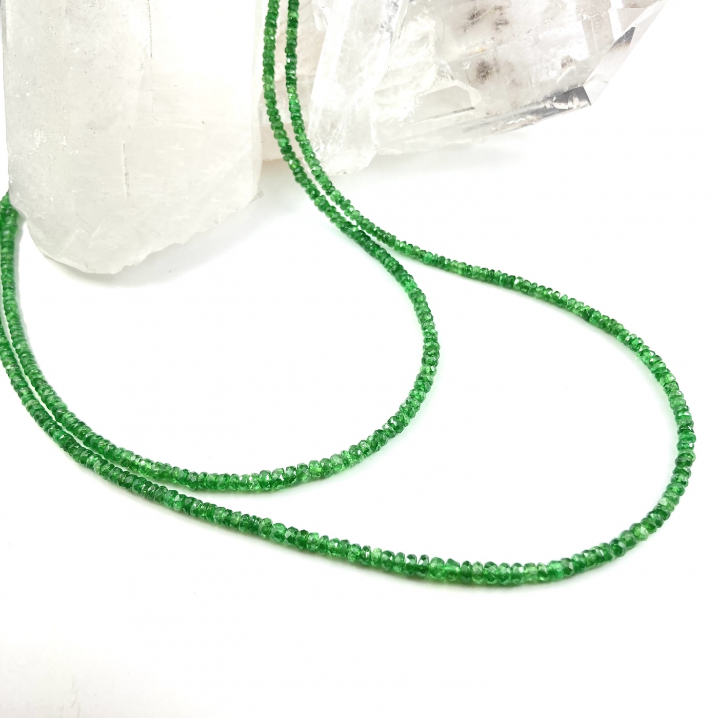 そんなグリーンガーネットを使ったネックレスは透明度と屈折率が高く、鮮やかなグリーンで煌びやかに輝きます。