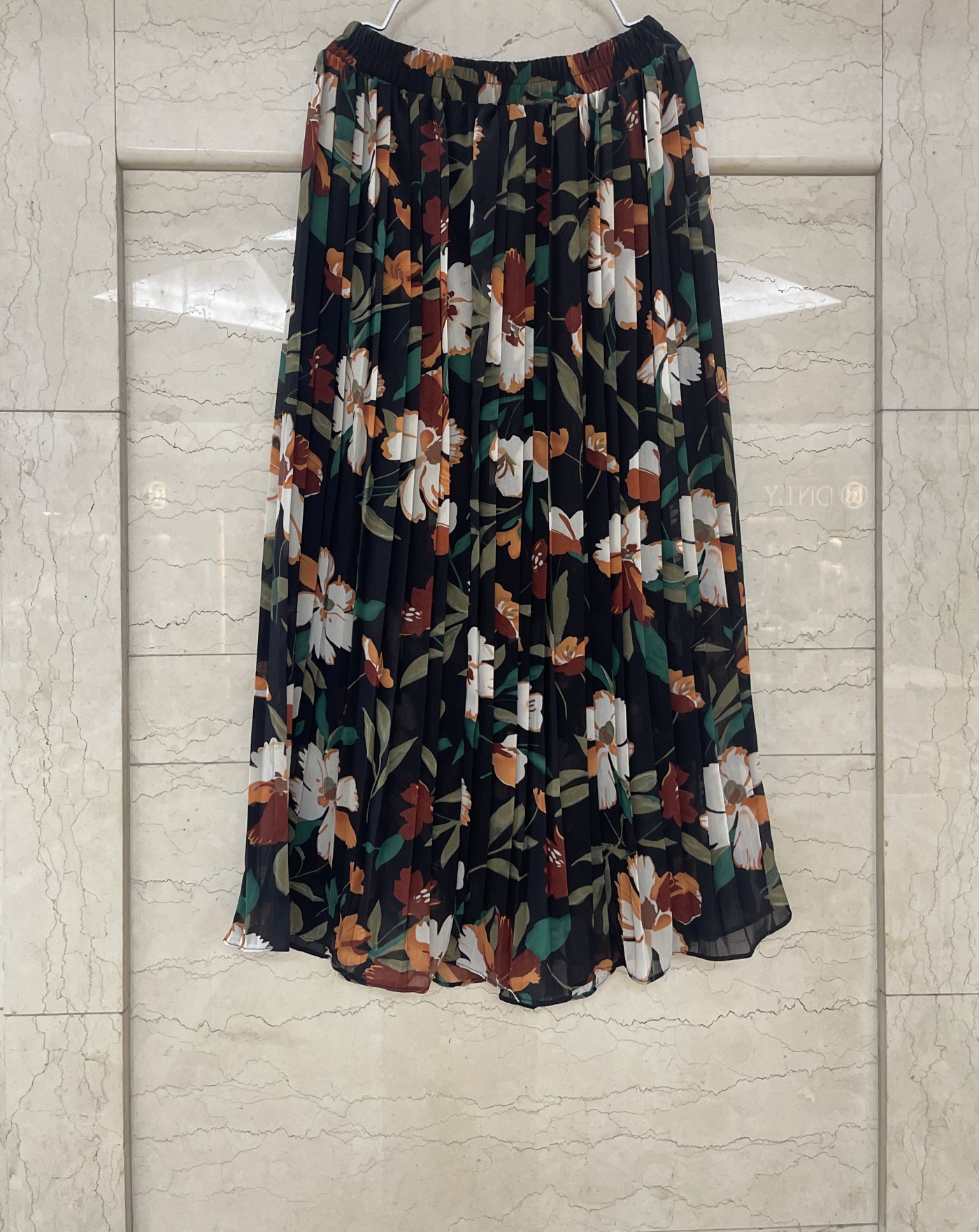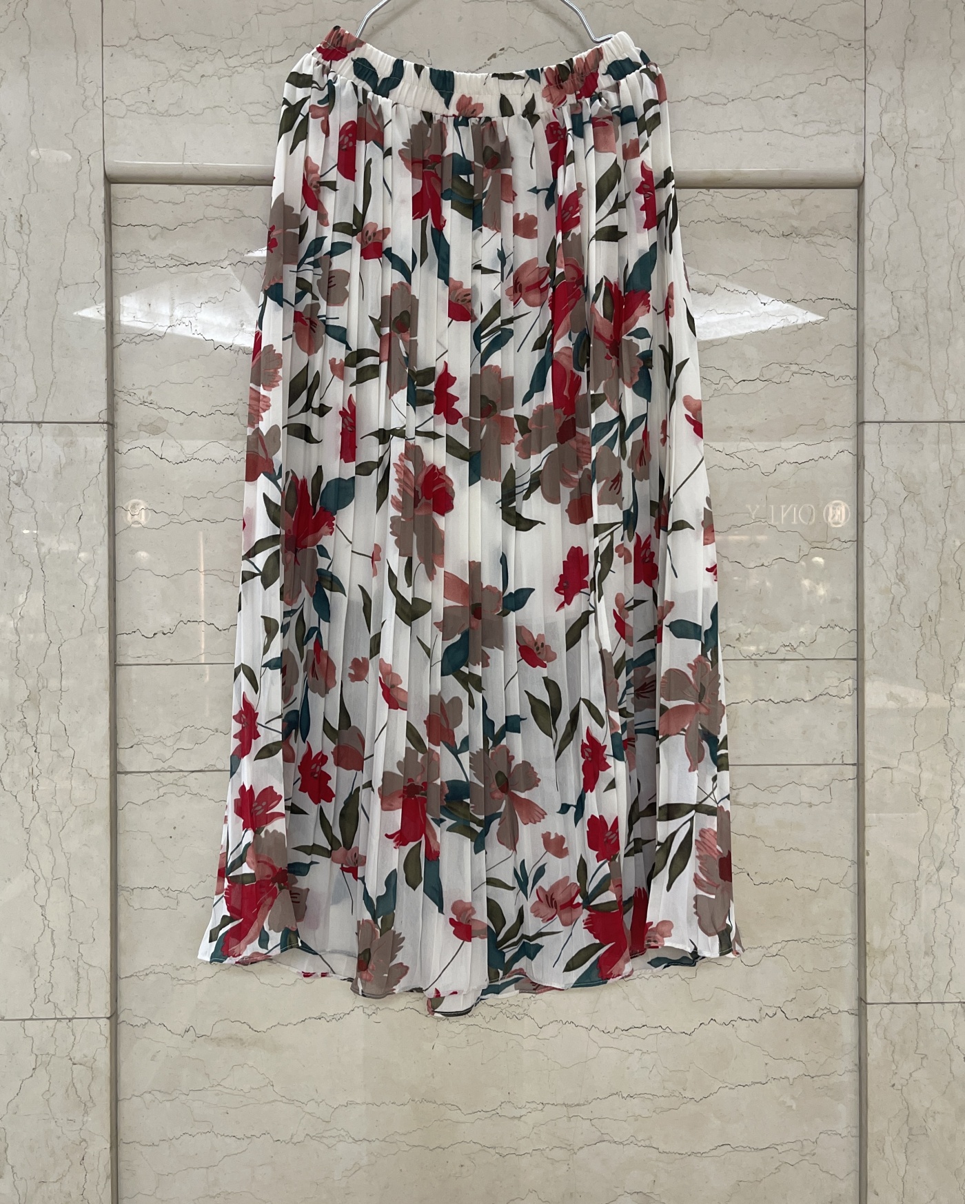 細めのプリーツで華奢な印象を醸し出すことができ、広がり過ぎないIラインに近いAラインのロング丈なので縦ラインが強調され着痩せ効果◎