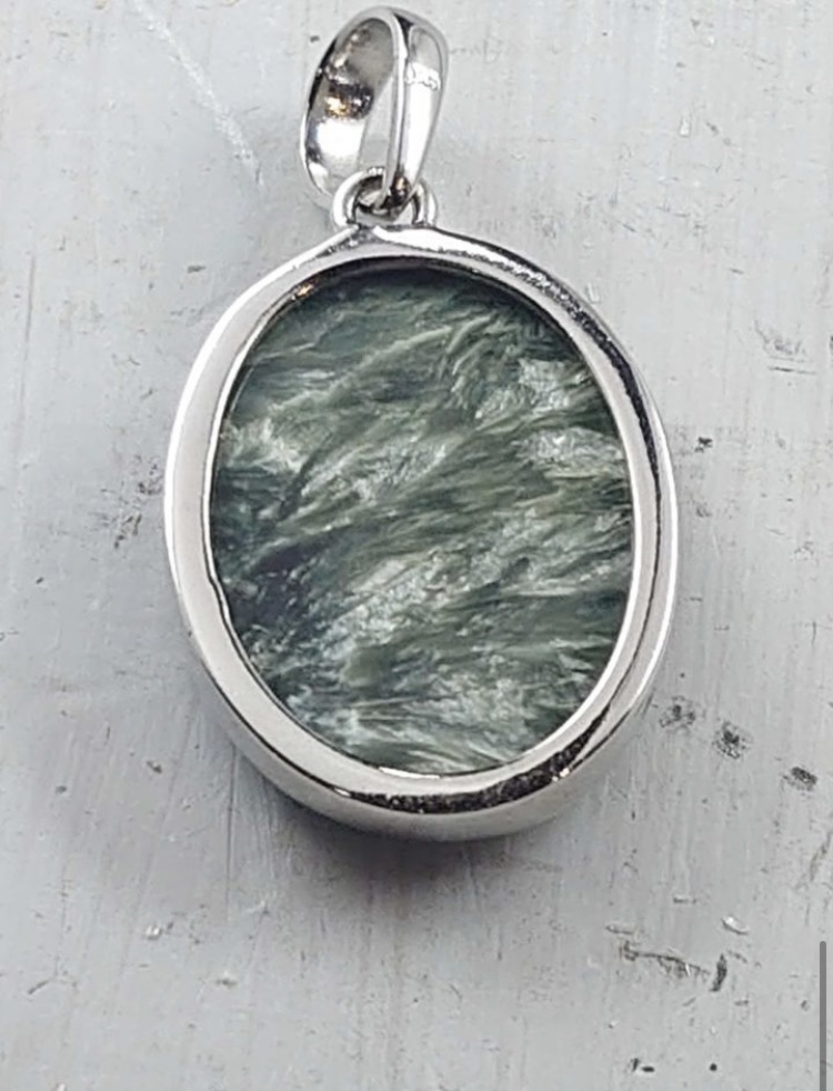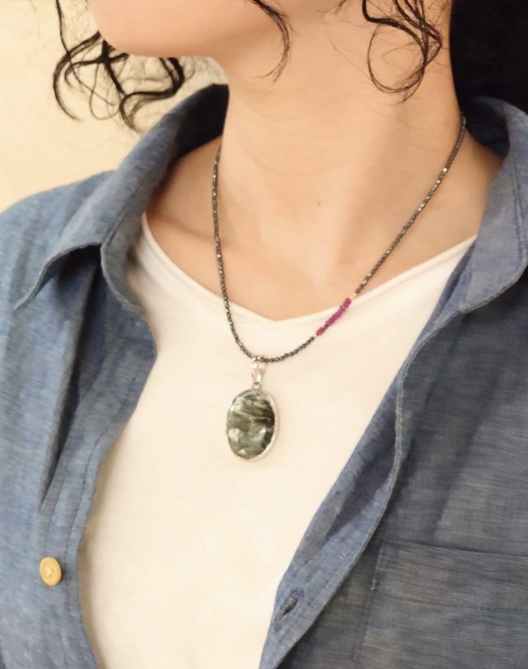 セラフィナイトは深い緑色に白く柔らかい羽のようなマーブル模様が特徴の天然石です。