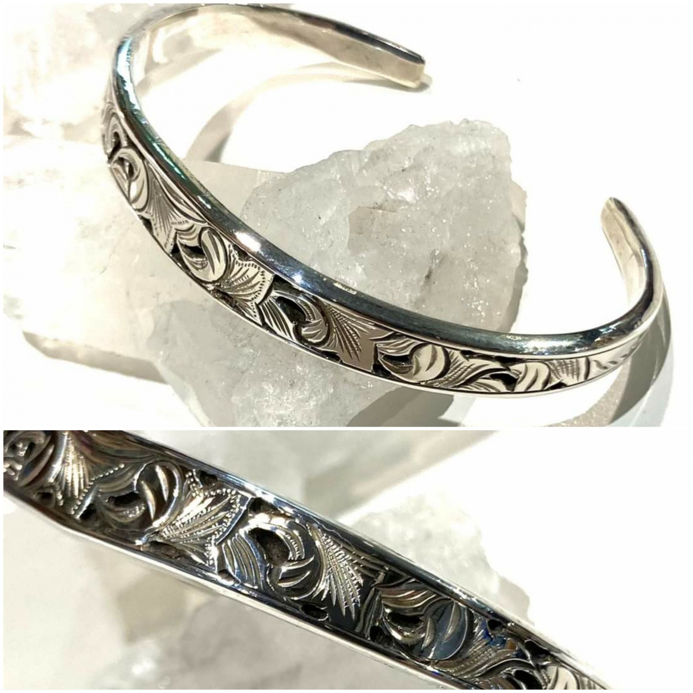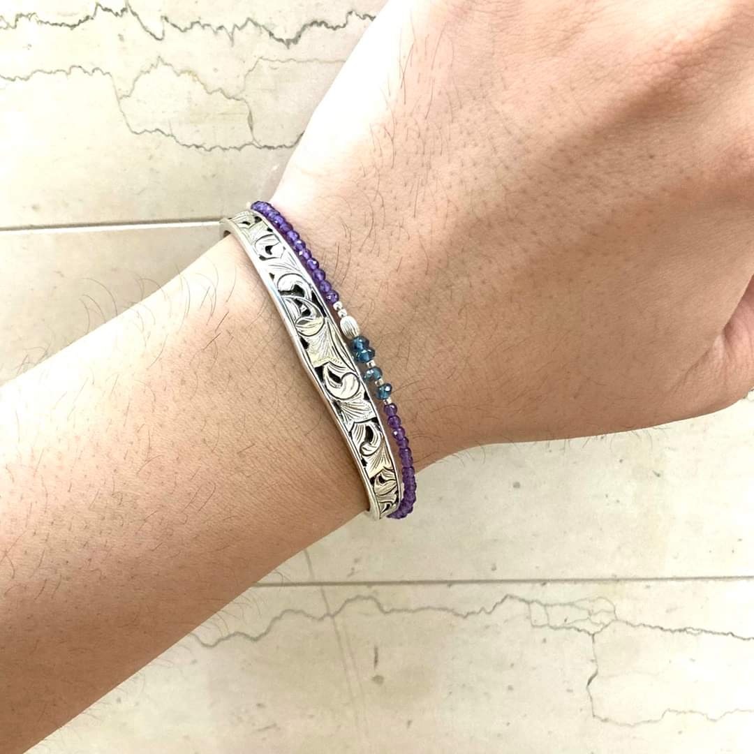 光り輝くエングレービングと燻のコントラストはシルバーに重厚感を与えていますので男性の方にもおすすめのバングルです。