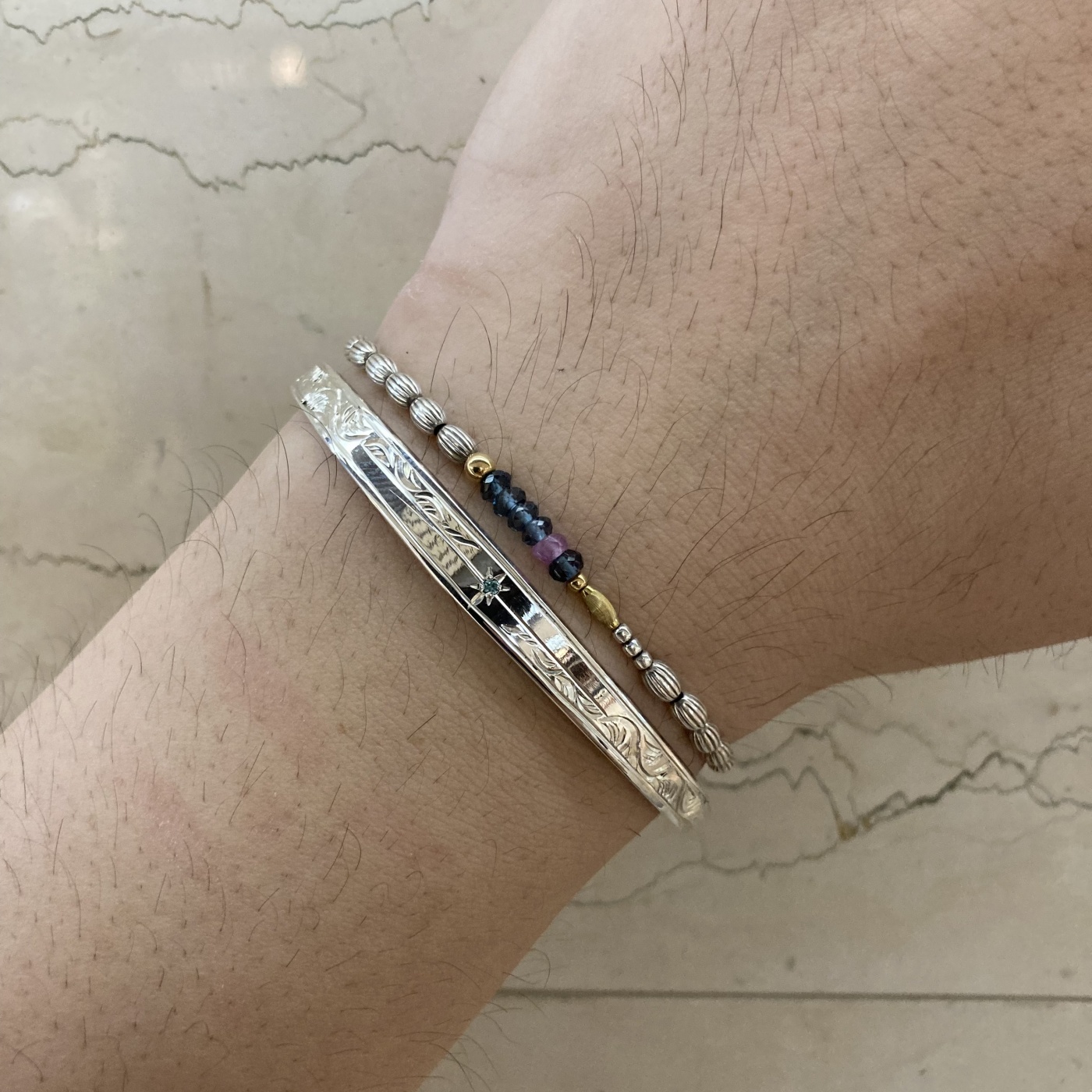 また、シルバービーズをメインに据えている事でシルバーのバングルとの相性も良く、重ね付けもおすすめになっています。