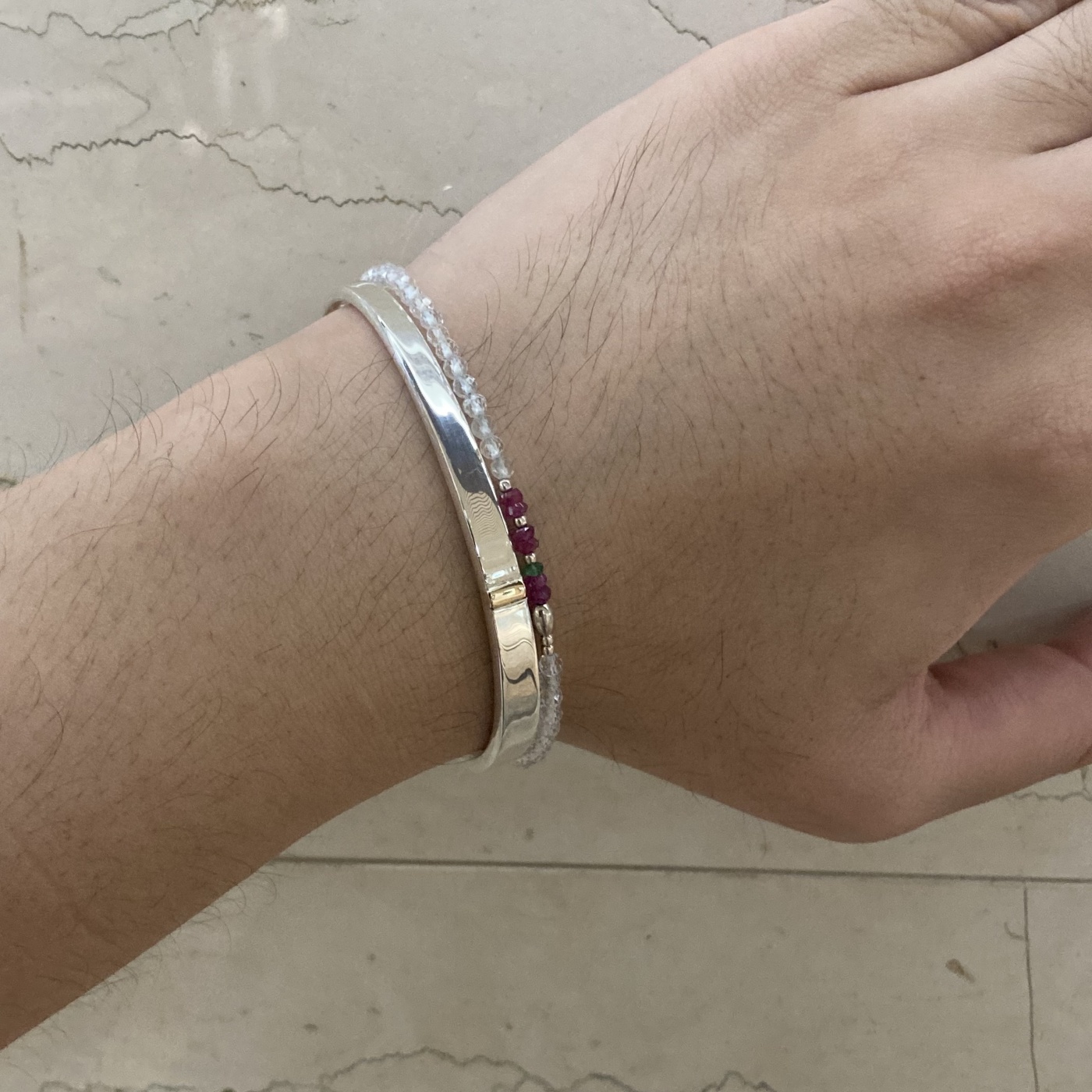 また、そのシンプルさからワイヤーブレスとも相性もよく、画像の様な透明感の高いトパーズにアクセントにカラーストーンを組み込んだ様な物とも合わせても素敵かと思います。
