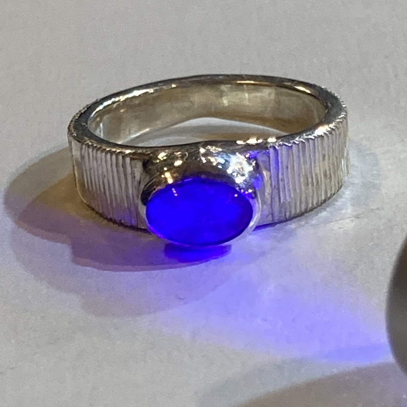 ラピスラズリにも似た濃く鮮やかなブルーが特徴的な宝石でさらにブラックライトで蛍光する特性があります。