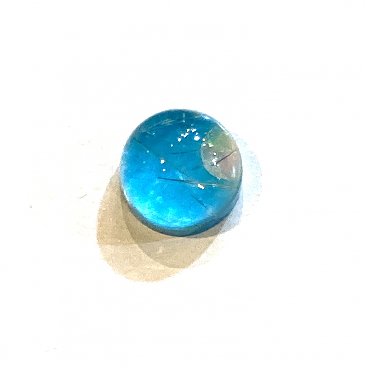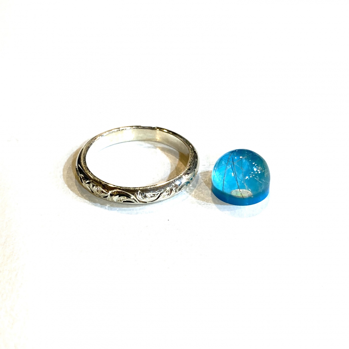 過去にも当店オリジナルの宇宙石のルースをご紹介したこともありましたが、その際のものはベースにラピスラズリを使用しており、今回ご紹介のものはターコイズをベースとすることで全体的に明るく、オパールの変幻自在の色合い、ルチルクォーツの煌びやかな内包物の輝きと相まって爽やかな印象を受けるルースとなっています。