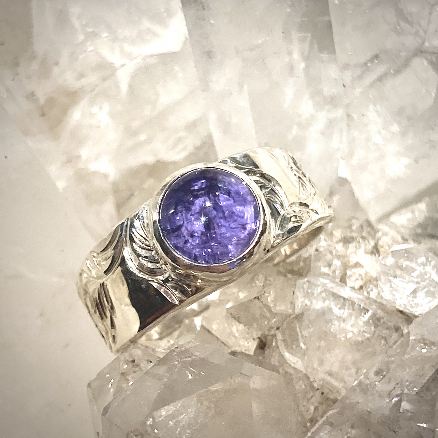 そんなタンザナイトを一方は輝く彫りのラインで彩り、もう一方は上下からラインを彫り込む事で、揺らめく炎の様な輝きで美しさを増しています。