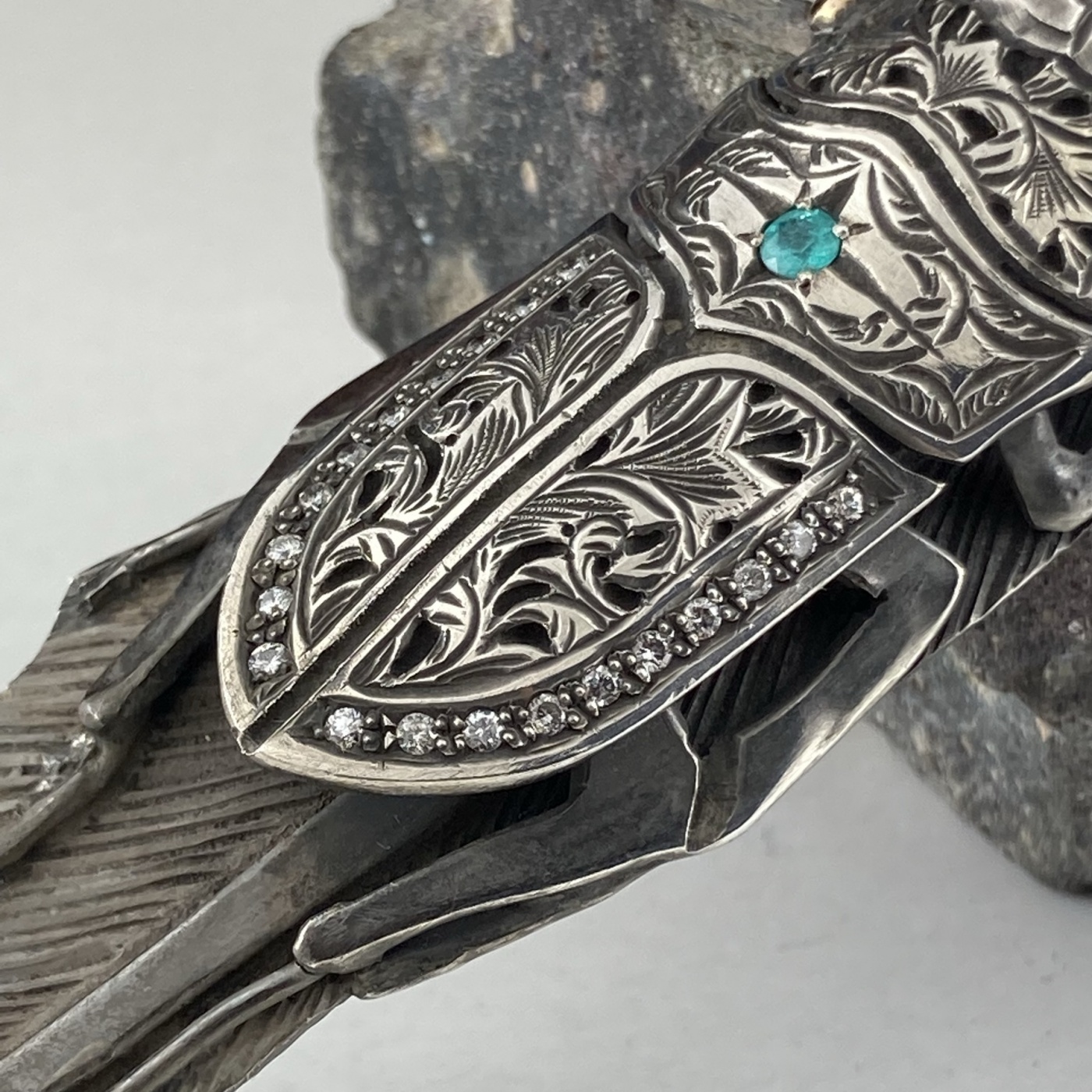 目の部分はゴールドを使用していて黒仕上げ、磨いたシルバー、そしてパライバトルマリンとダイヤモンドと大きめでインパクトあるアイテムながら高級感も兼ね揃えたペンダントトップとなっております。