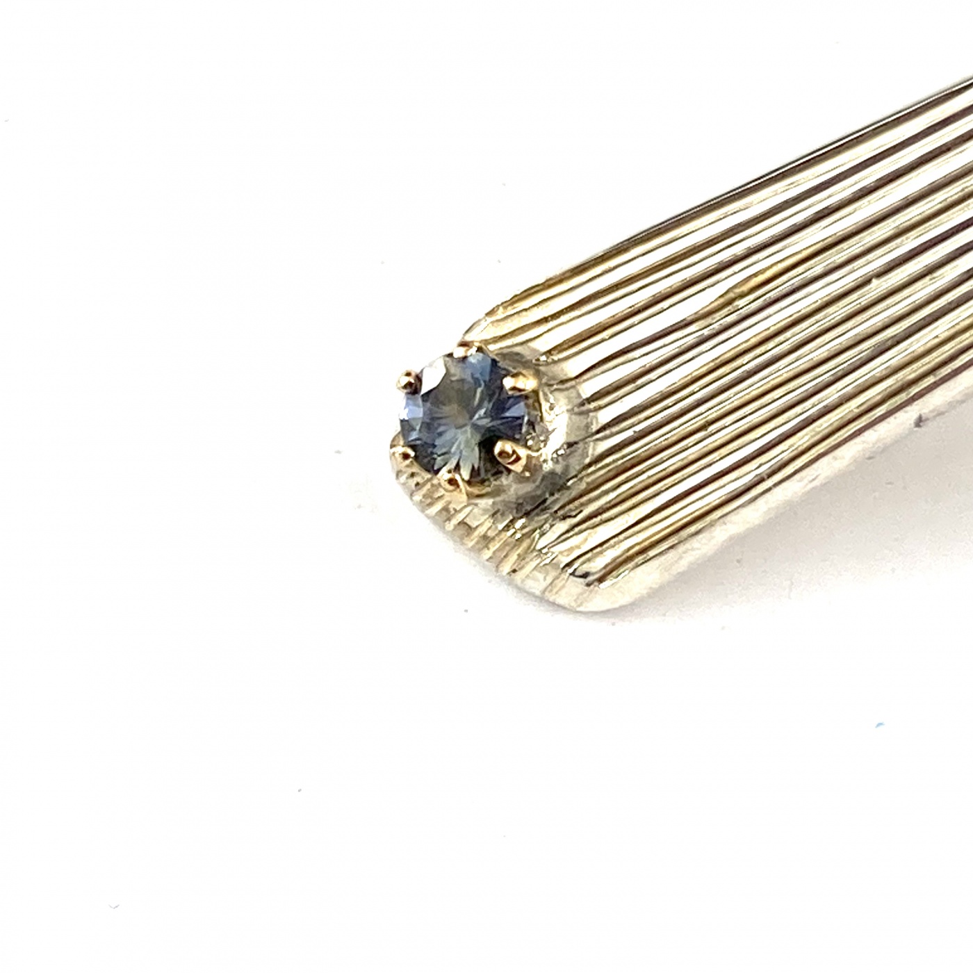 縦型のシルエットのペンダントは、着用した時にスマートな雰囲気を出してくれると共に、角度によって色の濃淡が変わって見える鮮やかなバイカラーサファイアとゴールドの台座とシルバーの本体とのコントラストが美しいペンダントトップとなっています。