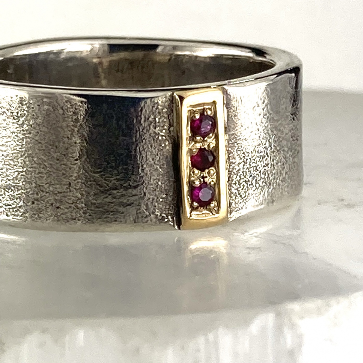 シンプルな中にインパクトのあるゴールドのパーツがセッティングされていまして、その中には深紅のルビーが3石施されています。