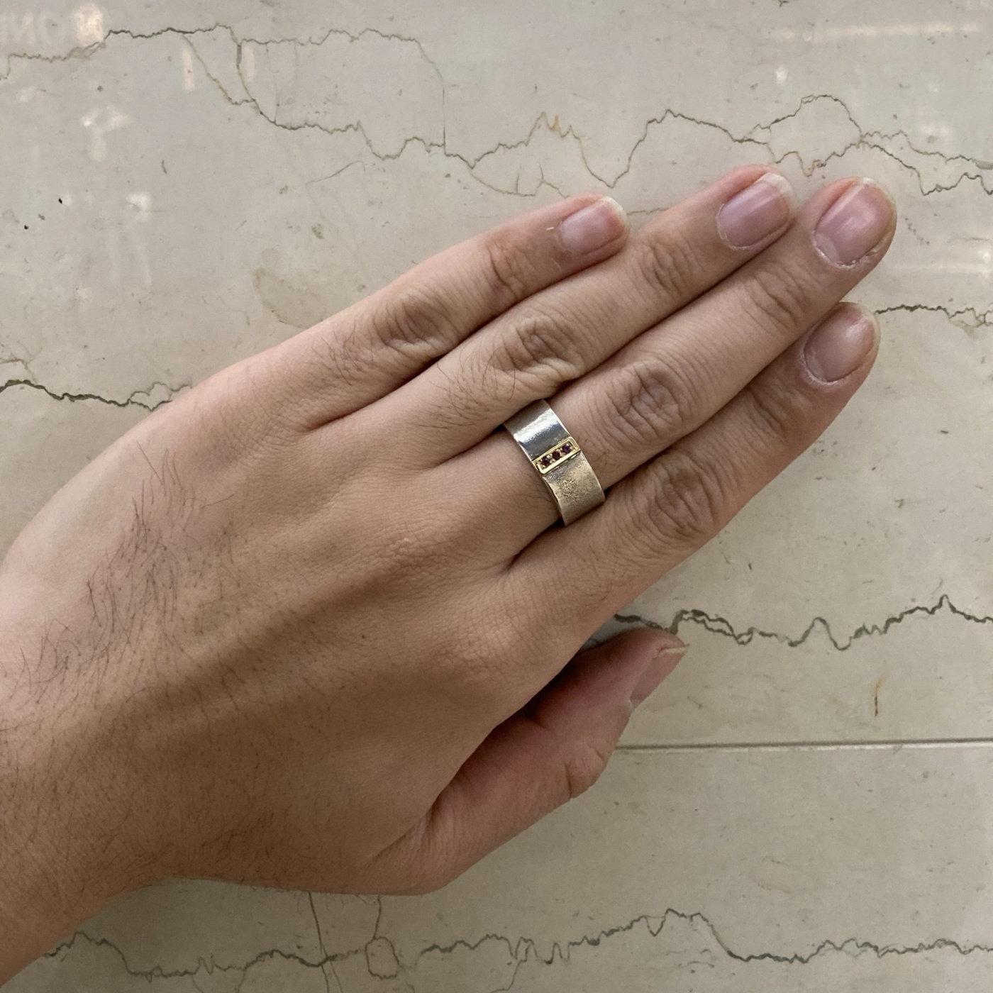 ベースは平打ちのリングに細かく表面に陰影のある質感が施されており、独特な表情を見せております。