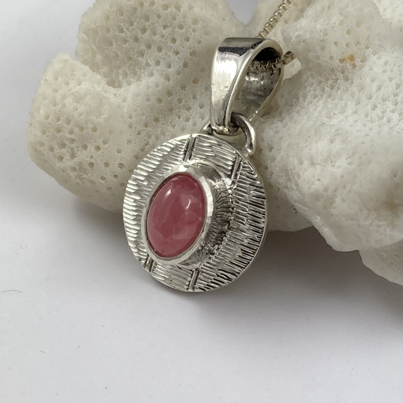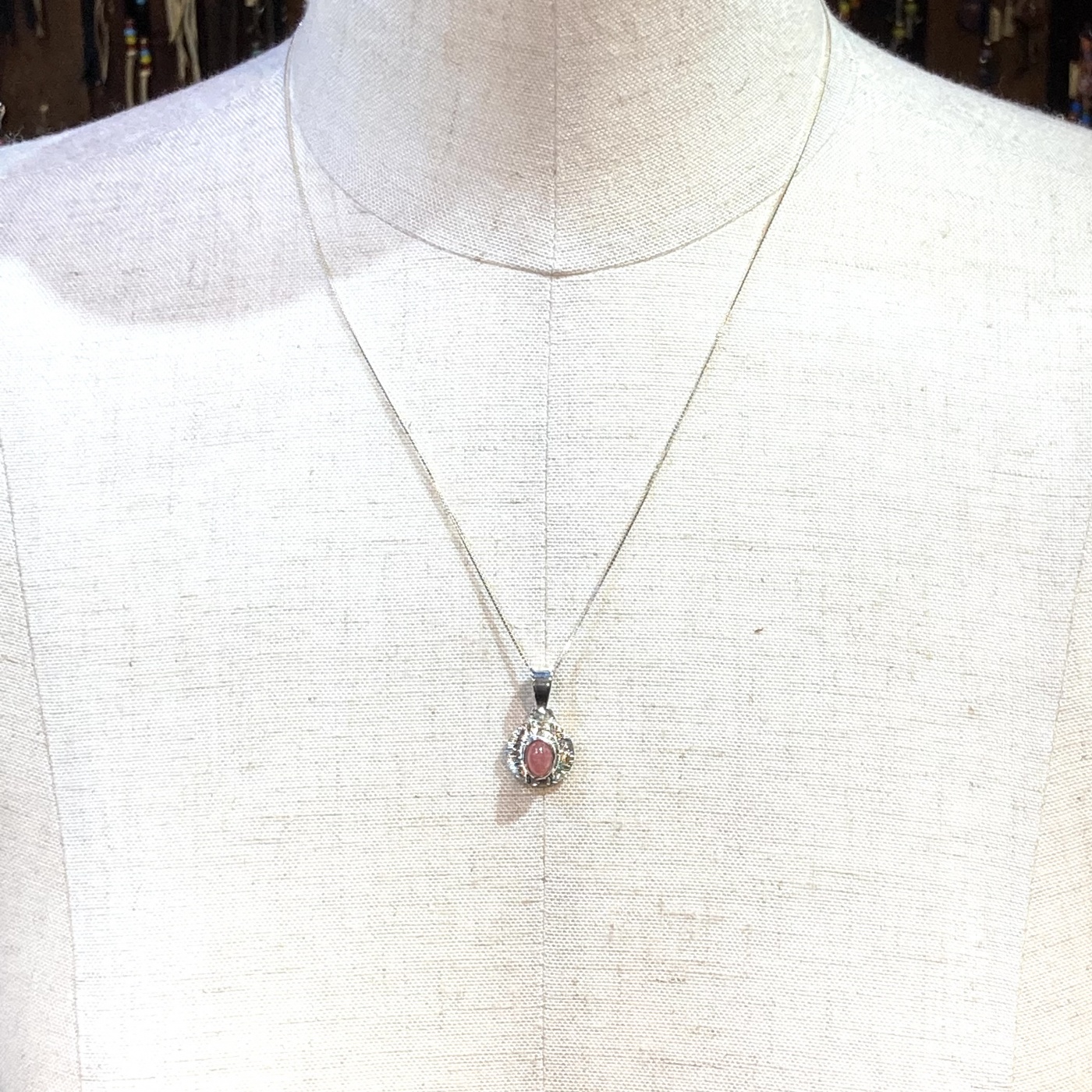 そんなロードクロサイトをゆらめく焔の様な彫り込みが囲んでいて灯火の中に薔薇が咲き誇るような幻想的にも思えるペンダントとなっております。