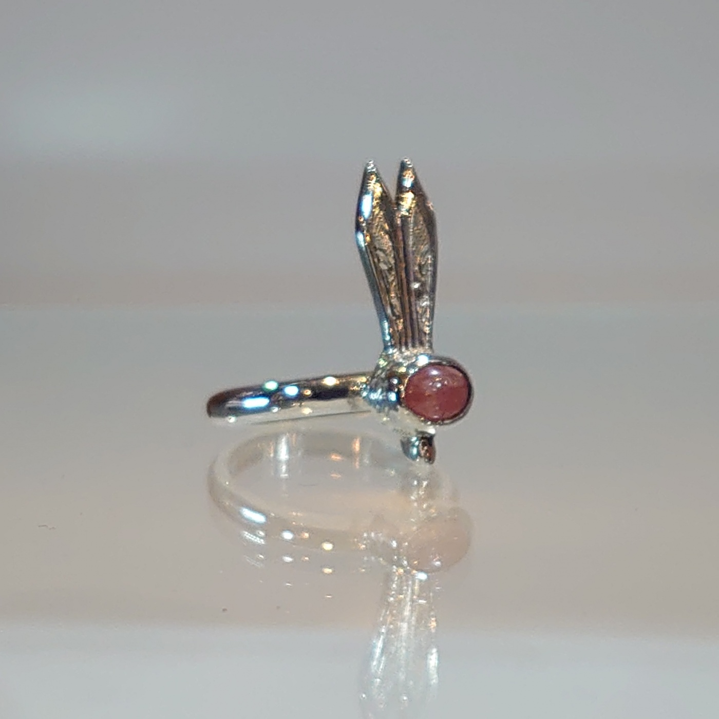 フェイスを天然石(ロードクロサイト)耳の部分をシルバーでデザインされたクールでキュートなリングが仕上がりました♡
