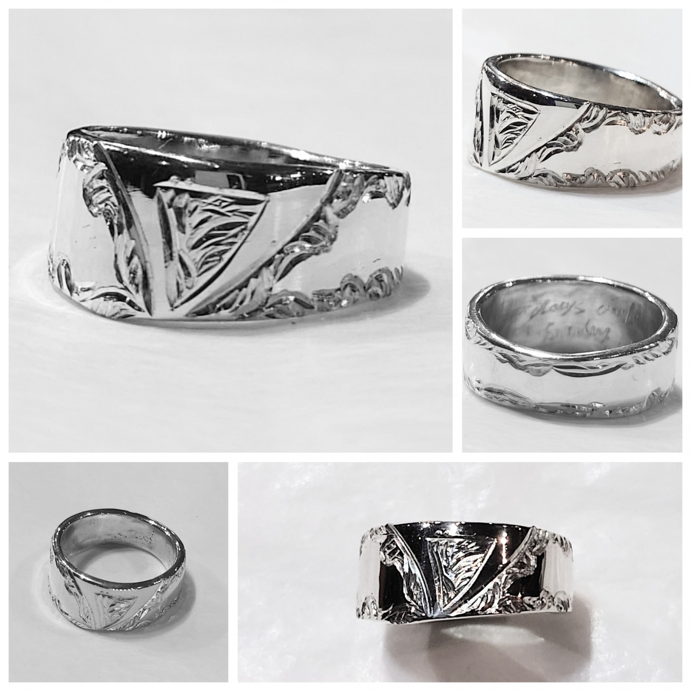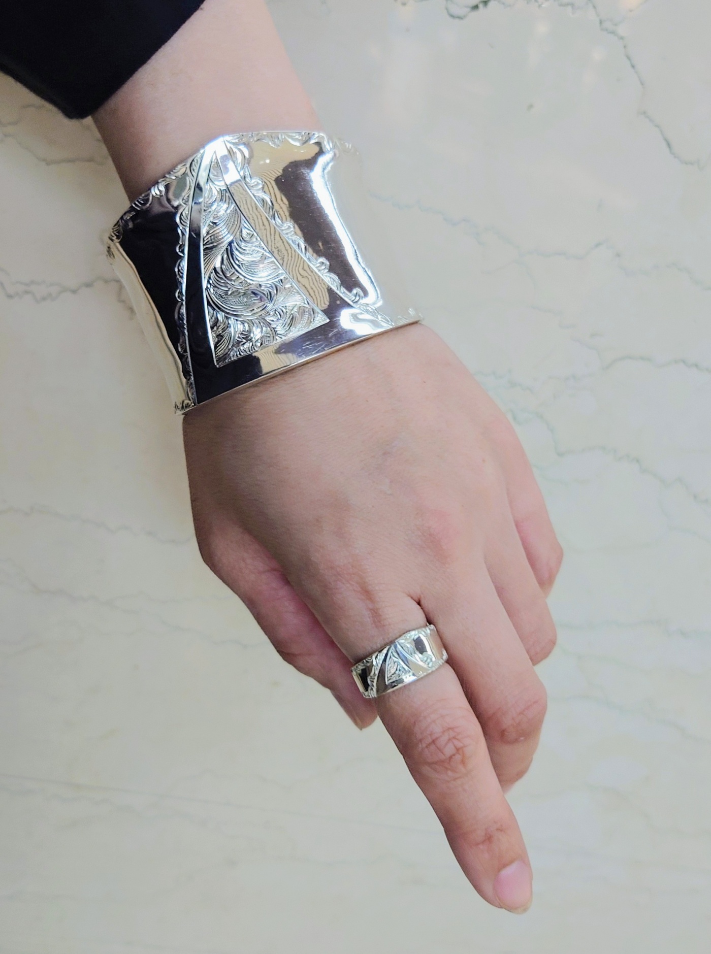 輝くほどに磨かれた鏡面加工のシルバーに繊細な彫刻が施され、その美しさに目を奪われてしまいます(*´∀`*)