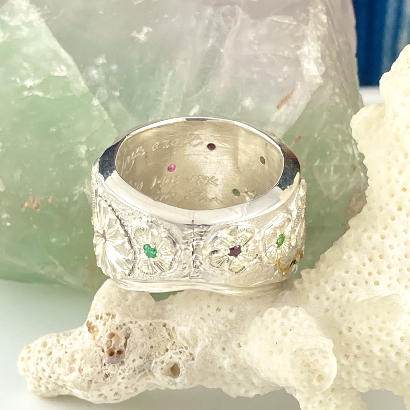 また24金の象嵌や花等に使われた様々な金位のゴールドと本体のシルバーの質感の違いの中に色とりどりの花に施された宝石の美しさを全周楽しめるリングです。