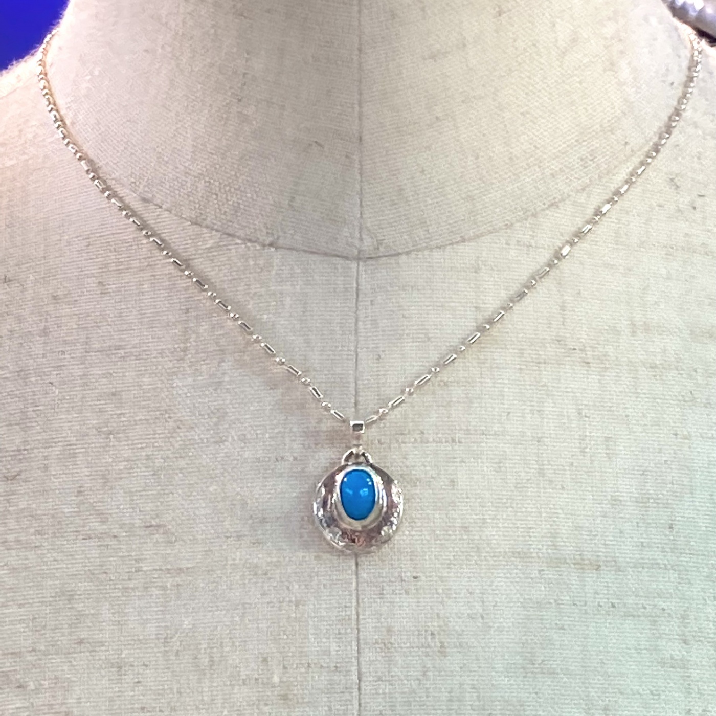 通常のターコイズより鮮やかなカラーのターコイズをメインに据え、周りに輝く彫りを施した胸元に彩りを添えてくれるペンダントです。