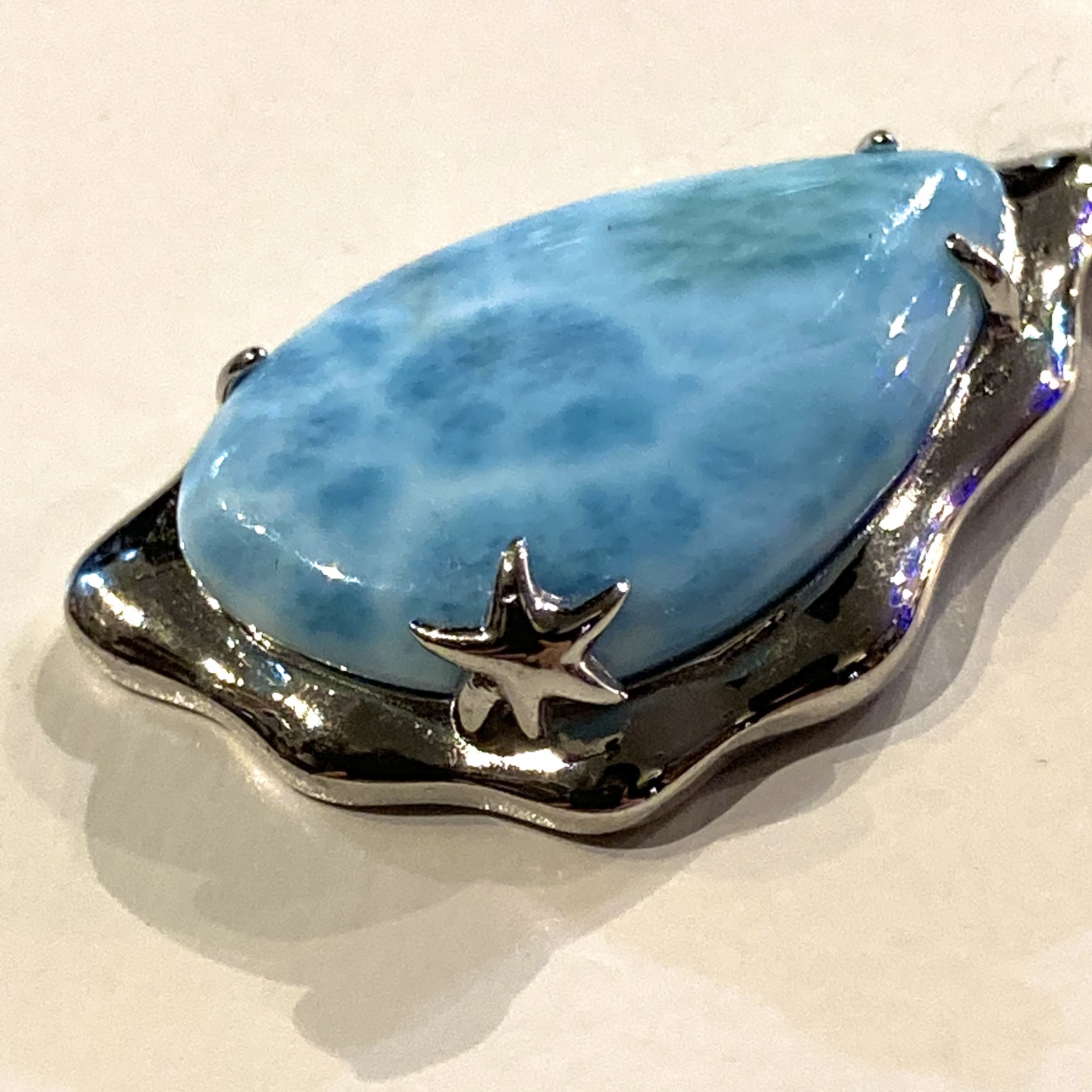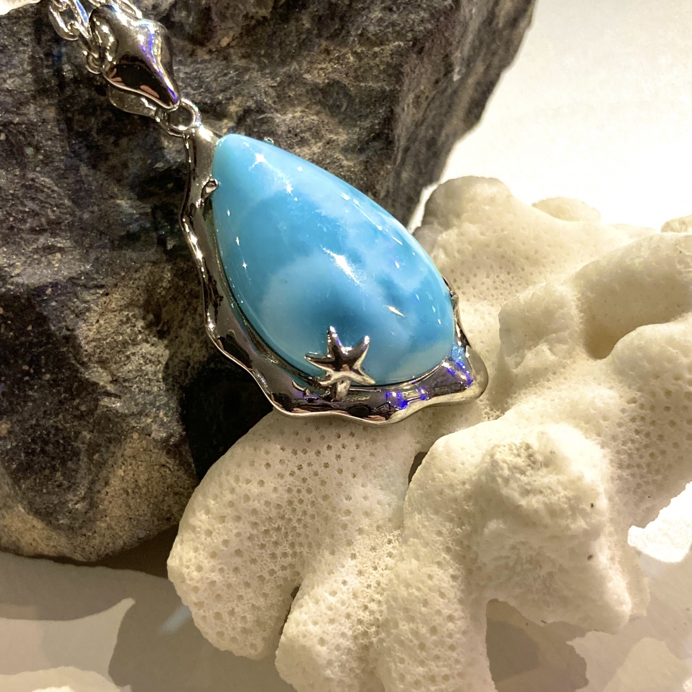 波を彷彿とさせるような形の石枠に南海を思わせる模様とカラーの美しいラリマー、ヒトデをあしらった爪で海をイメージしたような可愛らしいペンダントトップです
