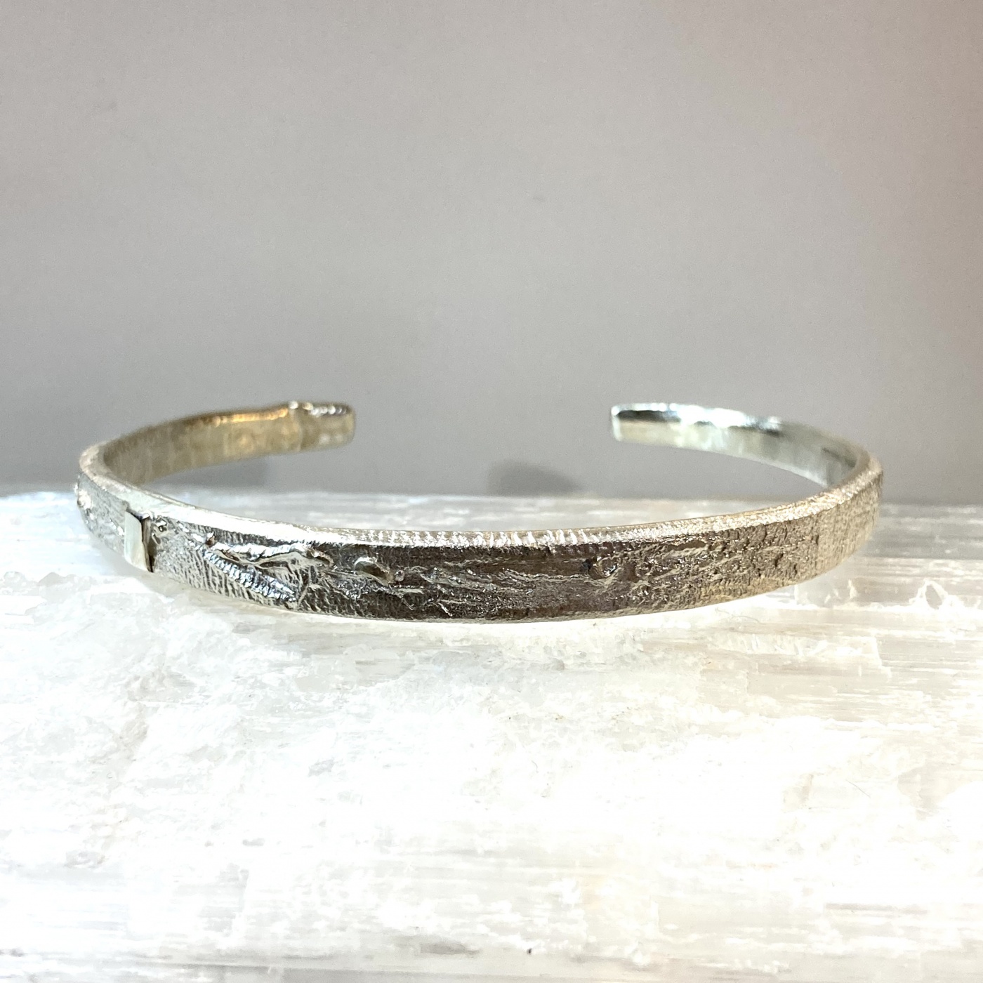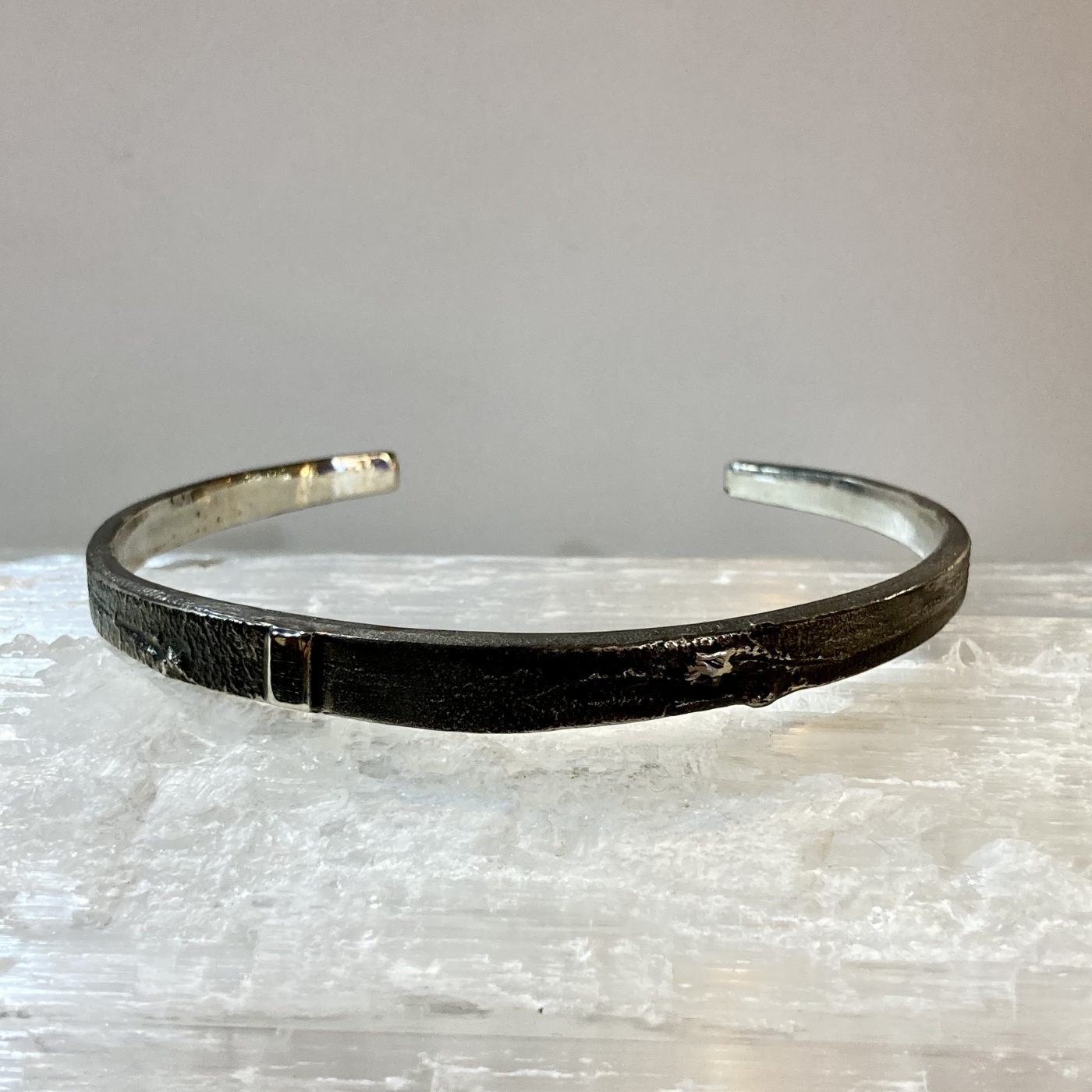 当店のリングで人気のshadowのバングルバージョンで独特の陰影に燻しを効かせて重厚な雰囲気を醸し出し、アクセントに磨かれたシルバーのラインをアクセントにしています。