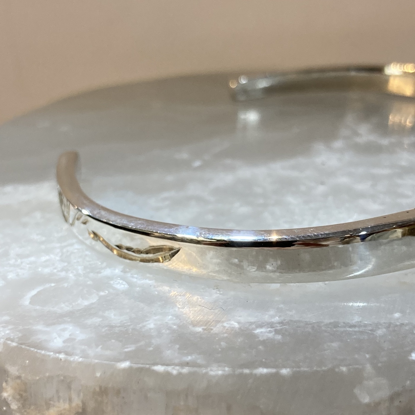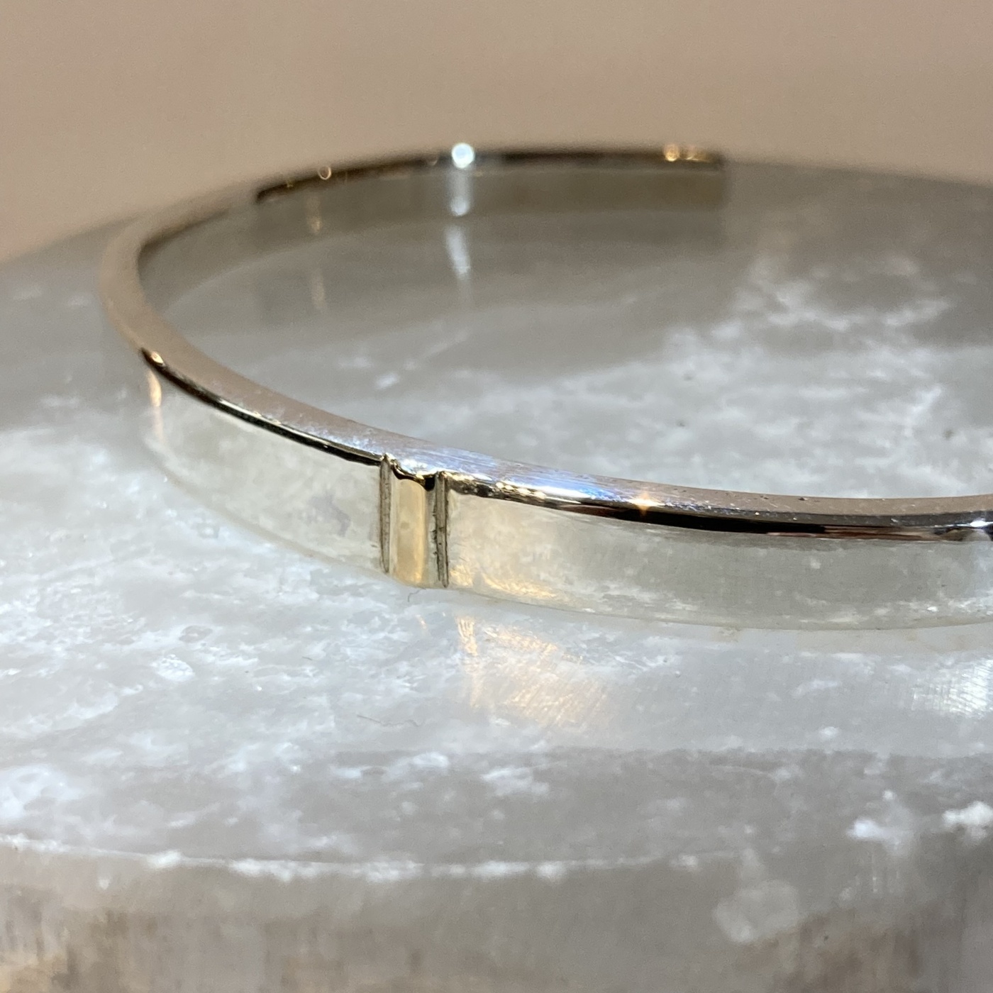 こちらのバングルはその名の通り無駄な装飾を省き、鏡面磨きを施すことにより、シルバーとワンポイントに配置された14kゴールドの輝きを最大限に生かした作りとなっております。