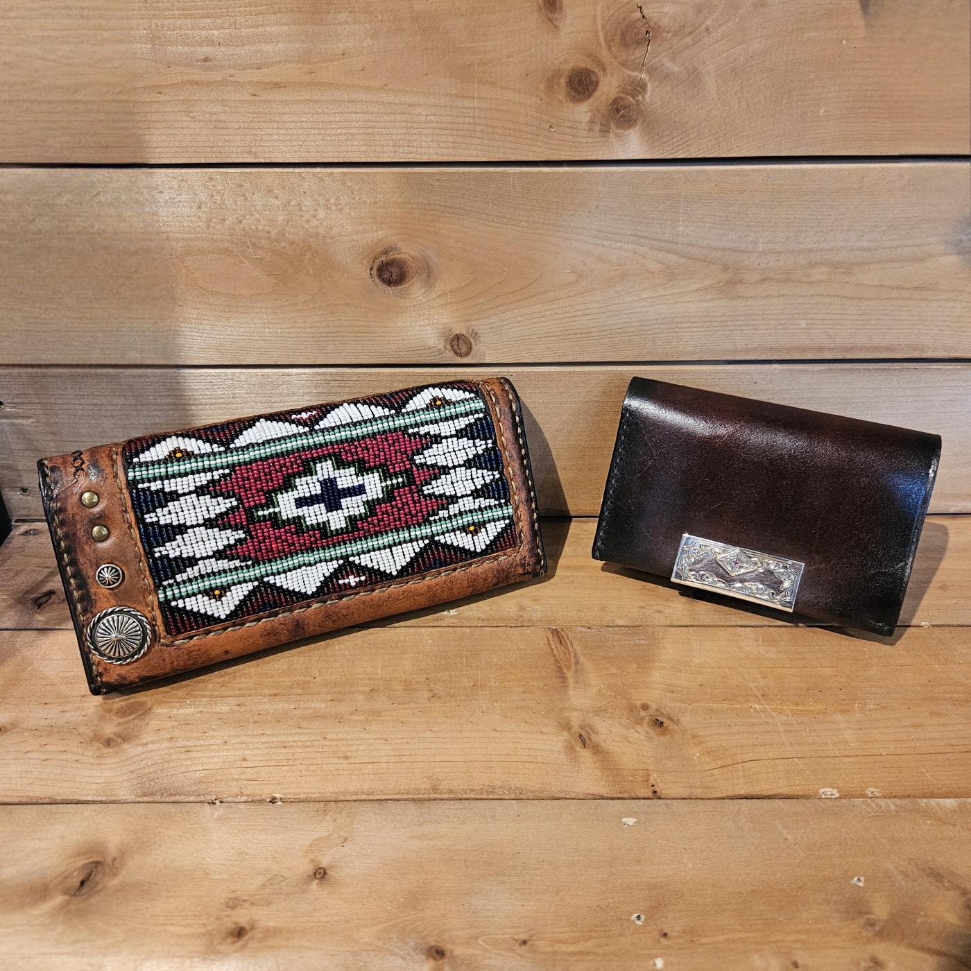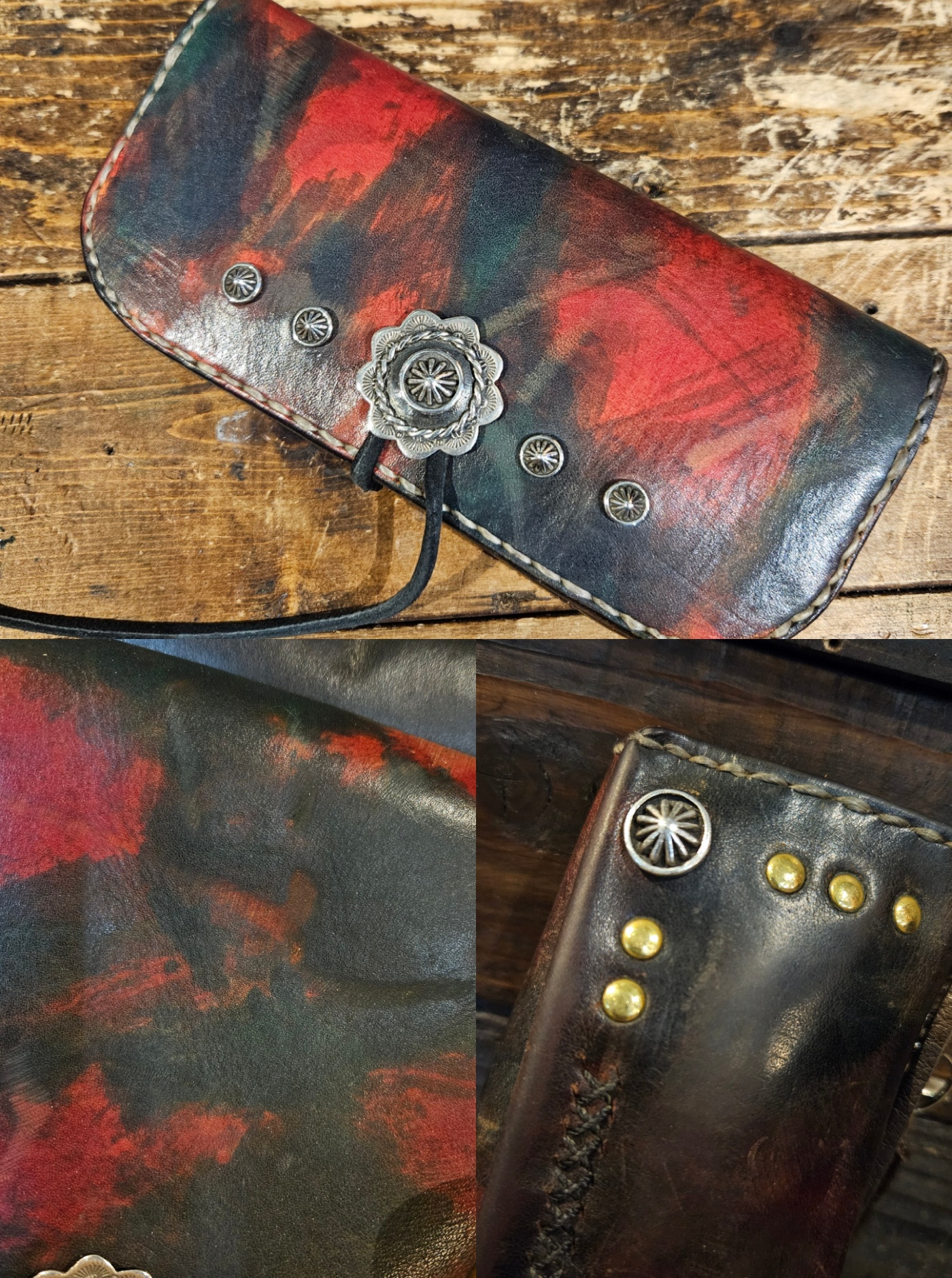 当店のレザーウォレットは、王道シンプルデザインのものから、ビーズワークやアートのようなカラーもの。(手染め)