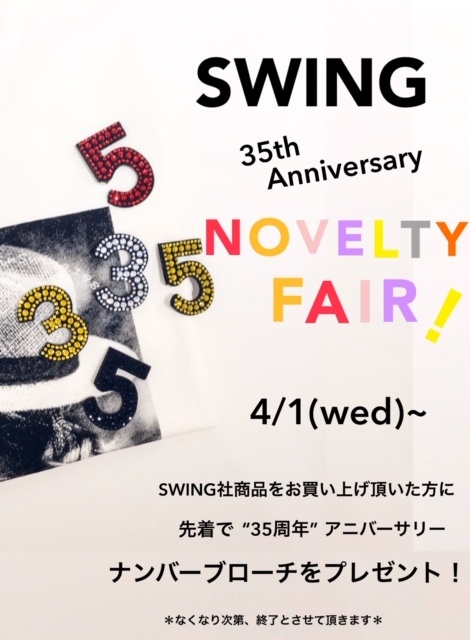 本日よりSWING社の商品をお買い上げ頂いた方に先着でナンバーブローチをプレゼントさせて頂きます♡