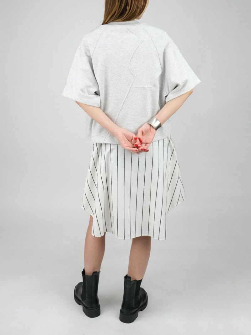 パッチワークスエットとストライプシャツがドッキングされたユニークなデザインで1枚でお洒落見えするアイテムとなっております。