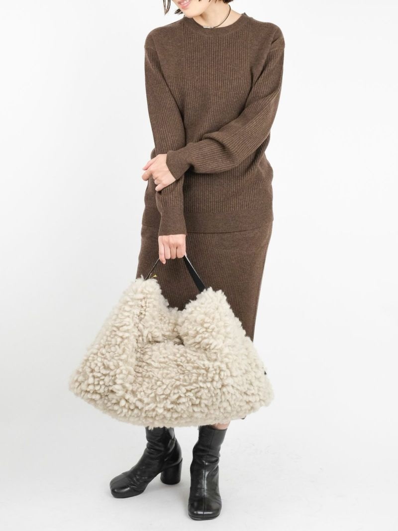 女性らしいやわらかな曲線が魅力でショルダー部分だけリブ編みにしない事でパネルがコンビニなっているかのような洗練された印象に。