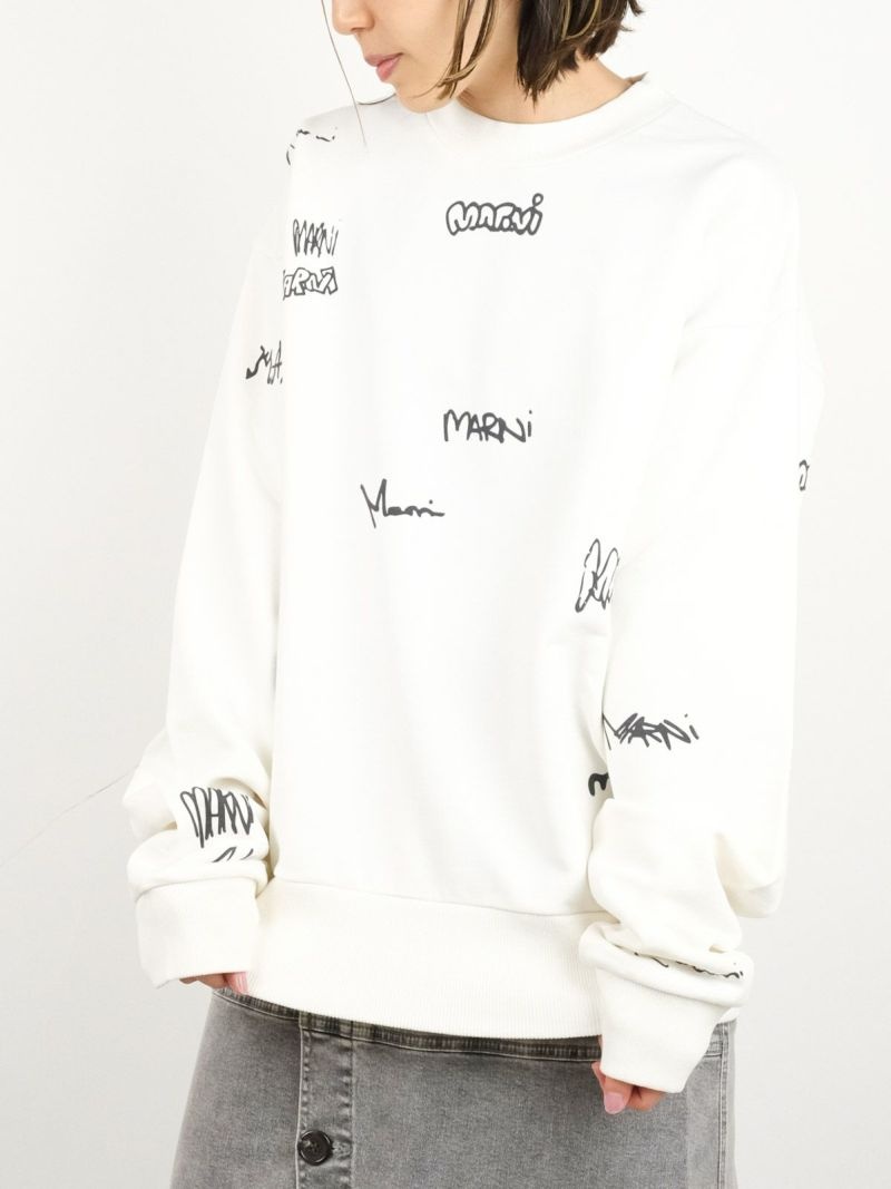 全面に施された存在感のあるMARNIロゴプリントが遊び心と都会的な洗練さを際立たせるクールネックトレーナーとなっております。